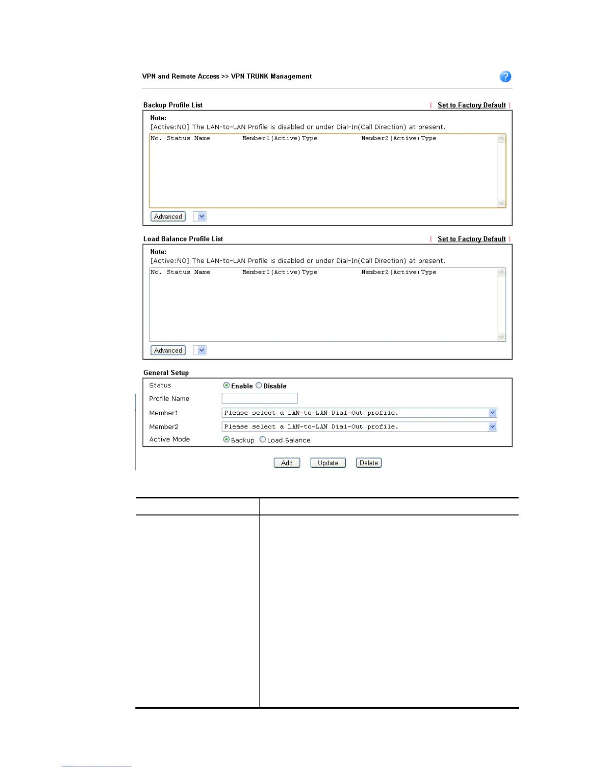 Backup Profile List Set to Factory Default - Click to clear all VPN TRUNK-VPN