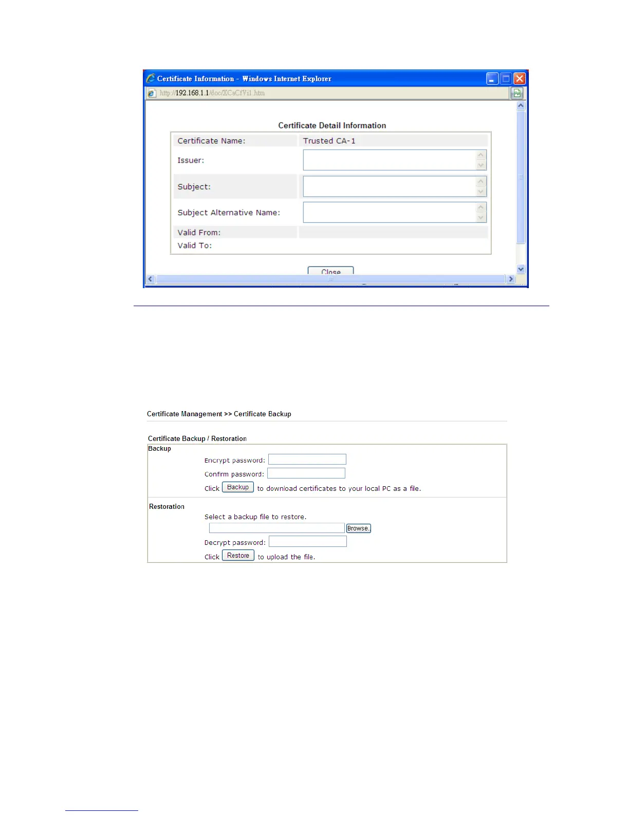 Local certificate and Trusted CA certificate for this router can be saved within one file.