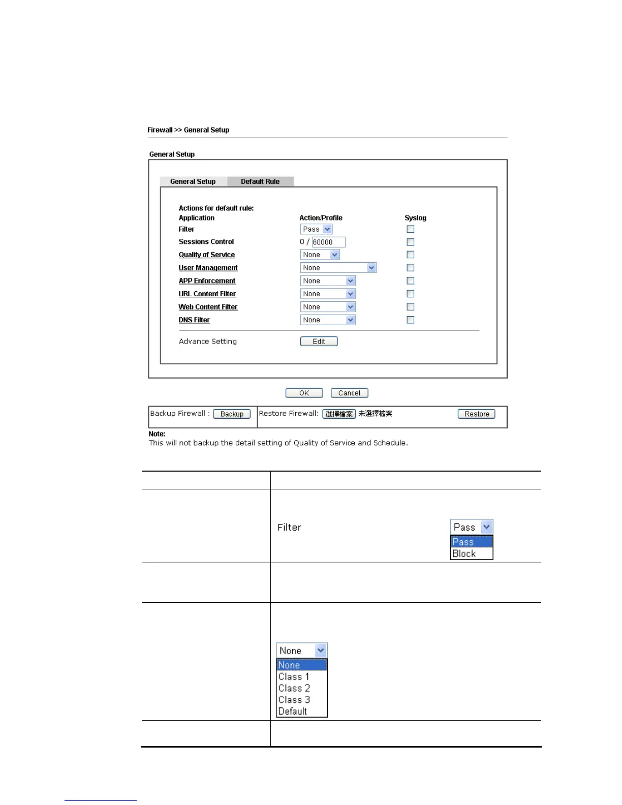 Such page allows you to choose filtering profiles including QoS, Load-Balance policy, WCF,