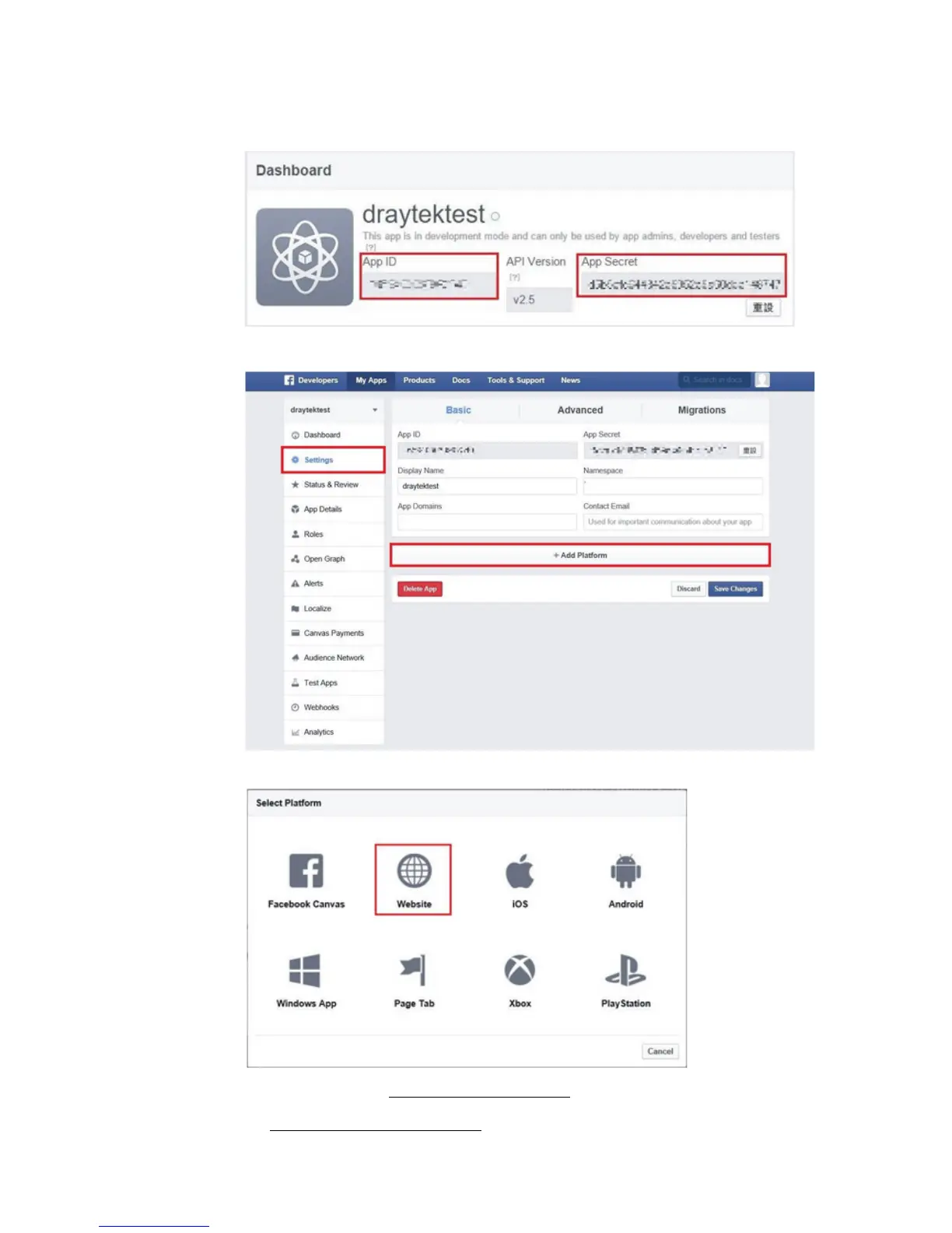 9. On Dashboard, user can get App ID and App Secret, these information will be used in