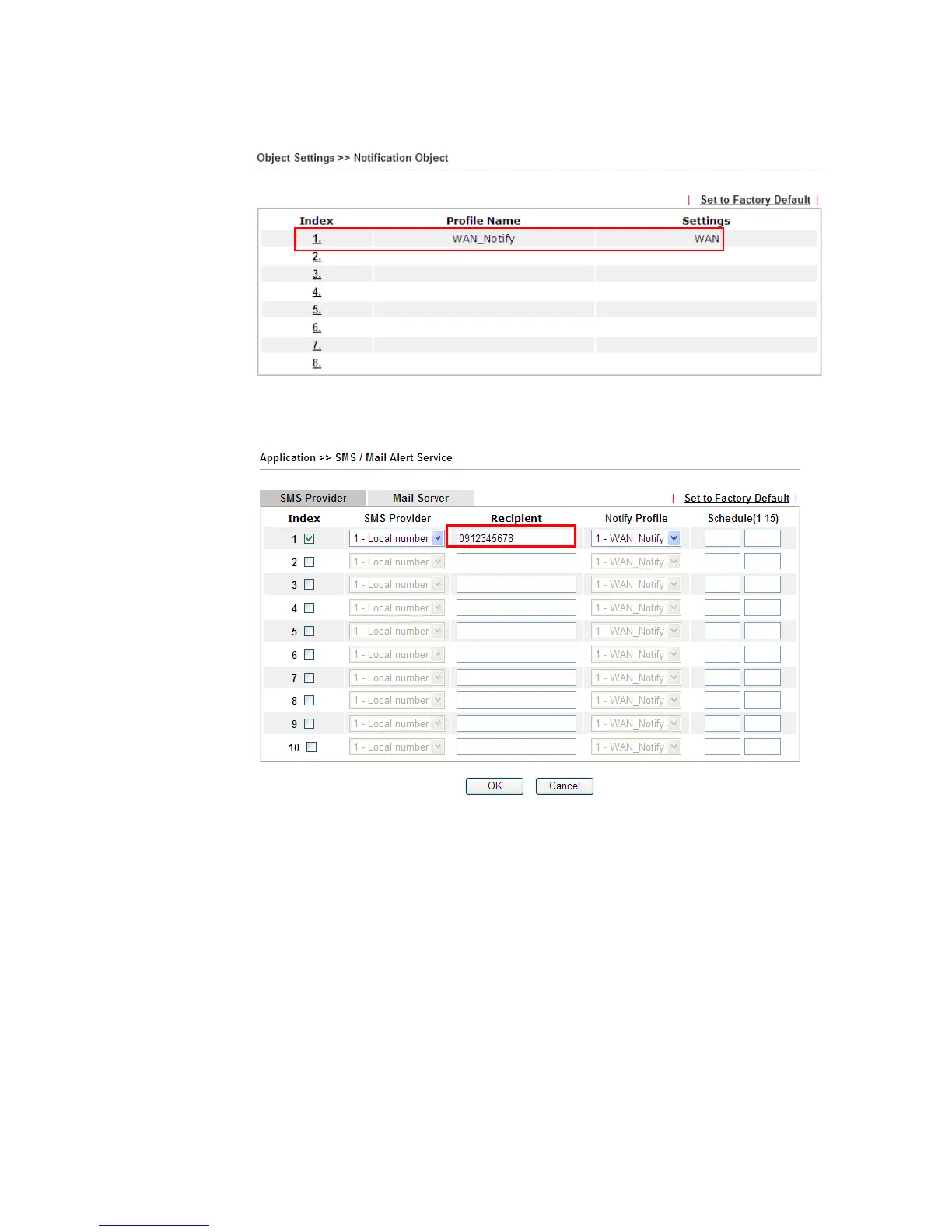 SMS Provider and the Notify Profile (specify the time of sending SMS). Then, type the