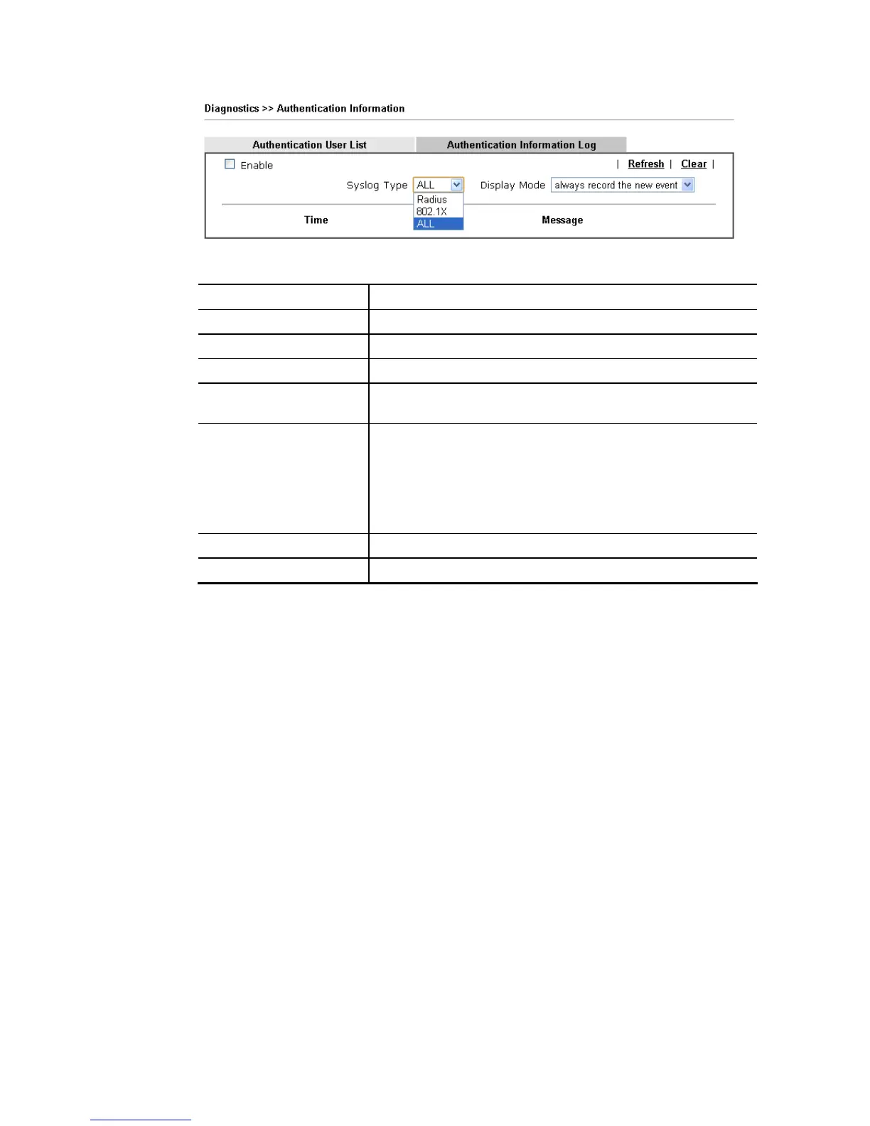 Syslog Type Specify RADIUS, 802.1X or All to display related authentication