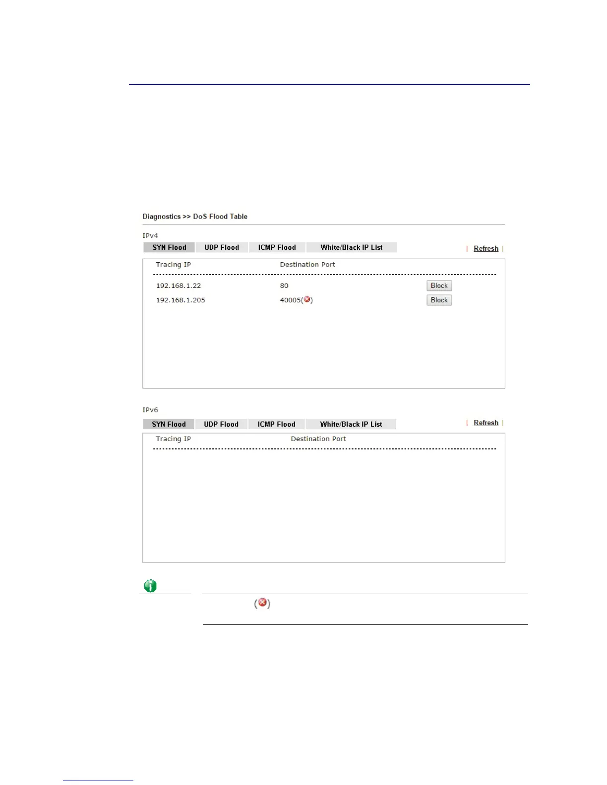 shortly by clicking the Block button shown on pages of SYN Flood, UDP Flood and ICMP Flood.