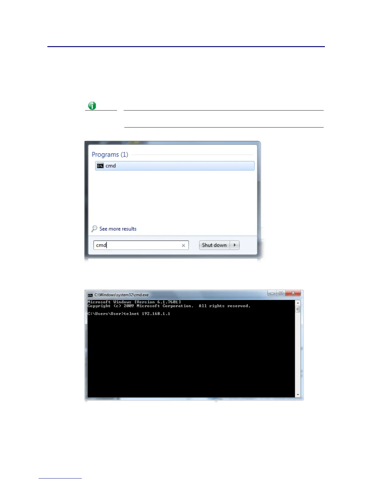 In the following window, type Telnet 192.168.1.1 as below and press Enter. Note that the IP