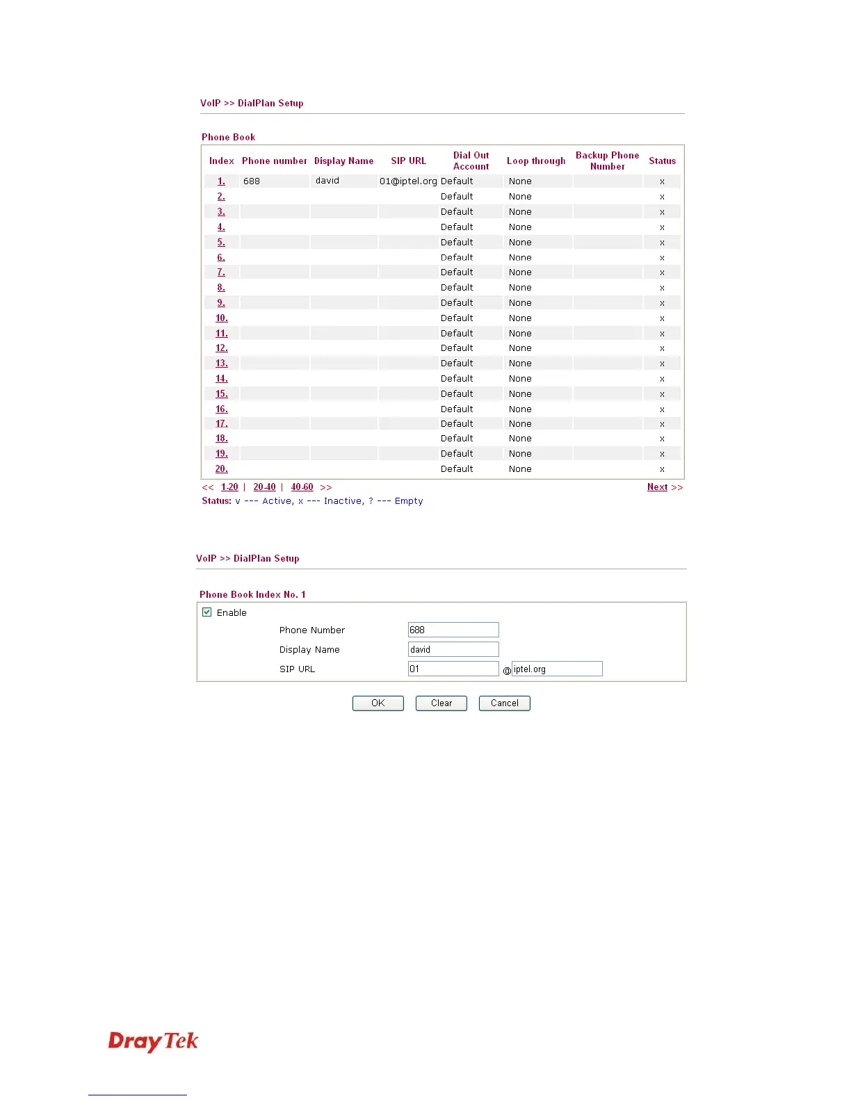 Click any index number to display the dial plan setup page.