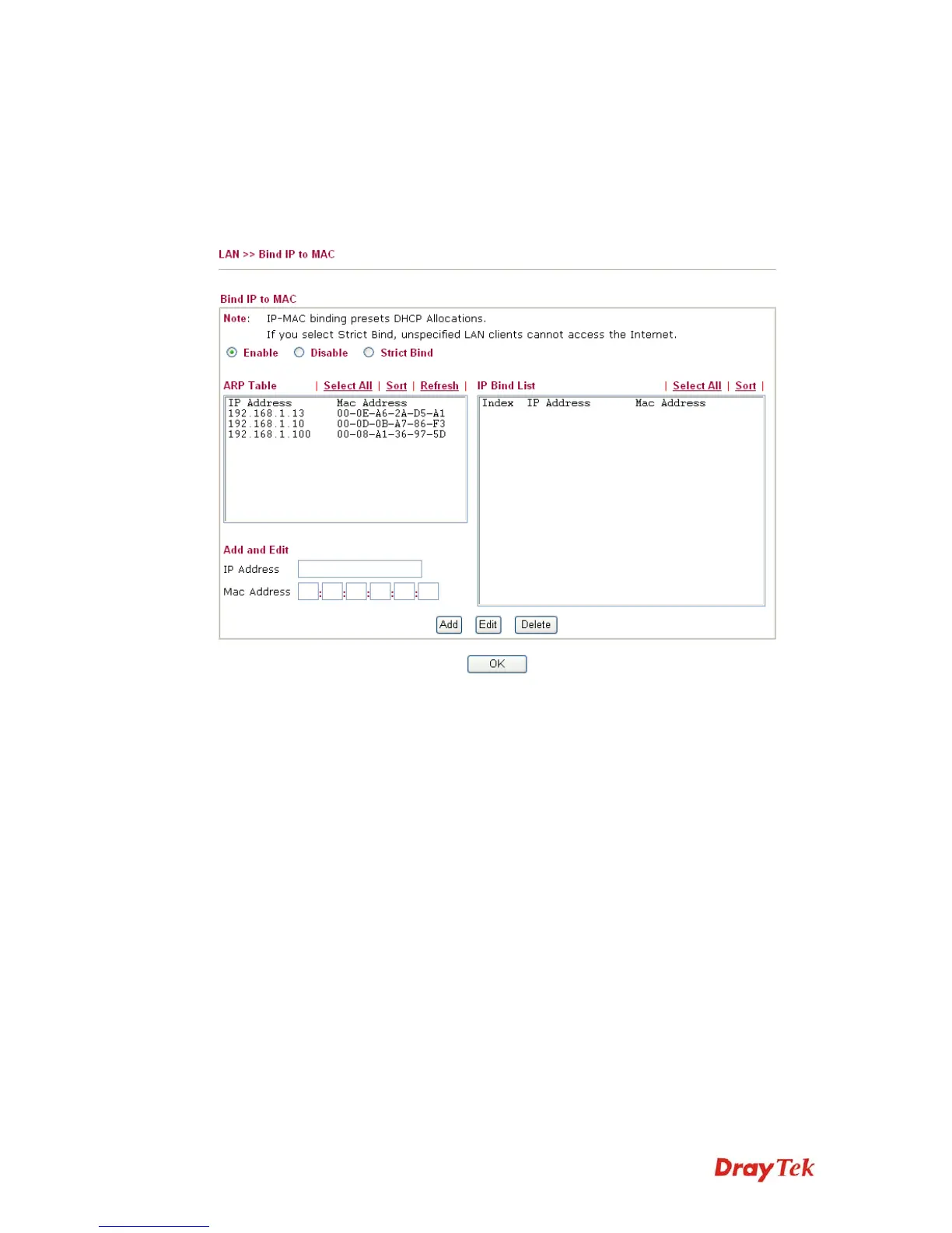 network. When this function is enabled, all the assigned IP and MAC address binding