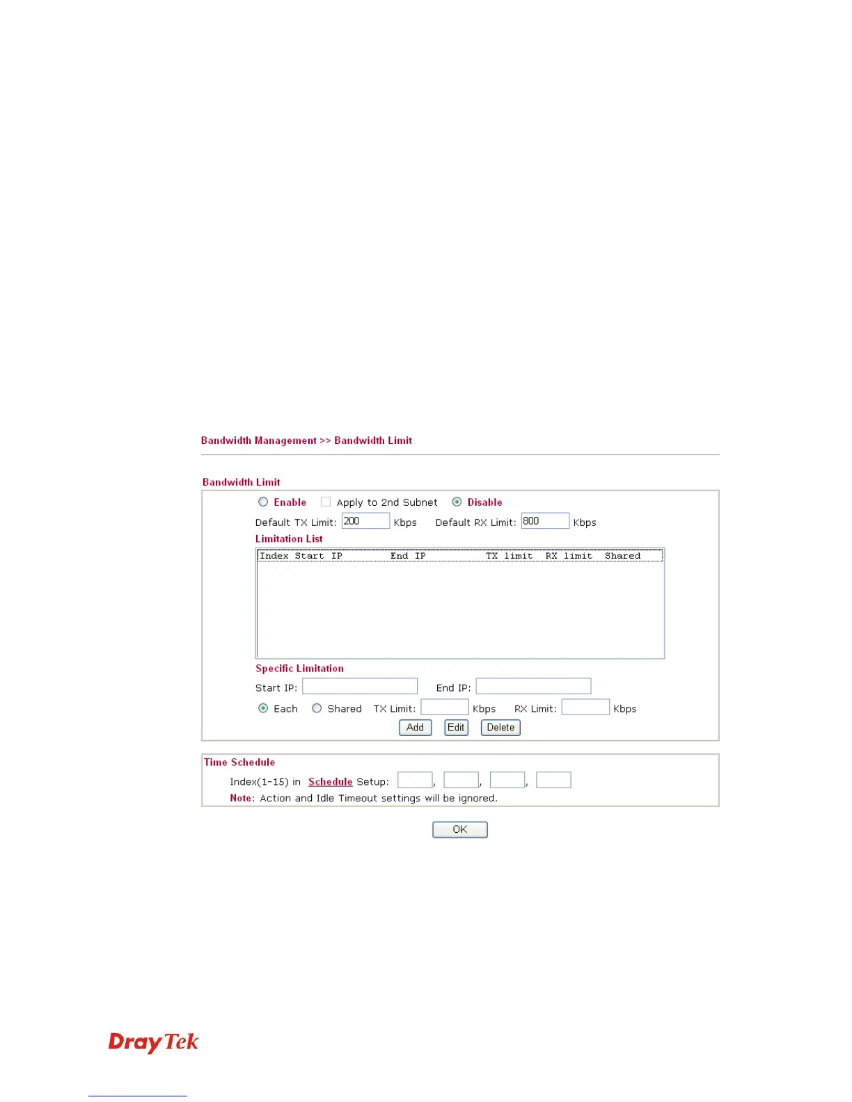 Disable Click this button to close the function of limit bandwidth.