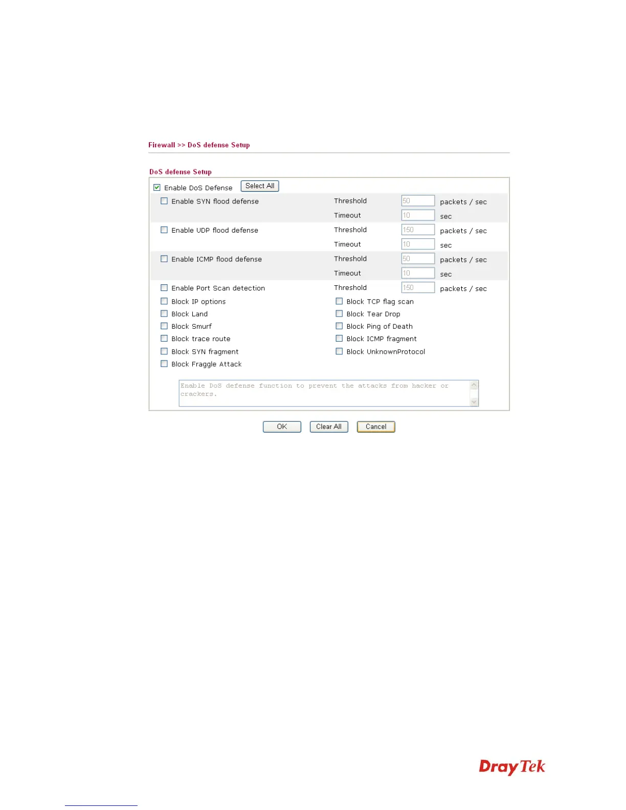the DoS Defense setup. The DoS Defense functionality is disabled for default.