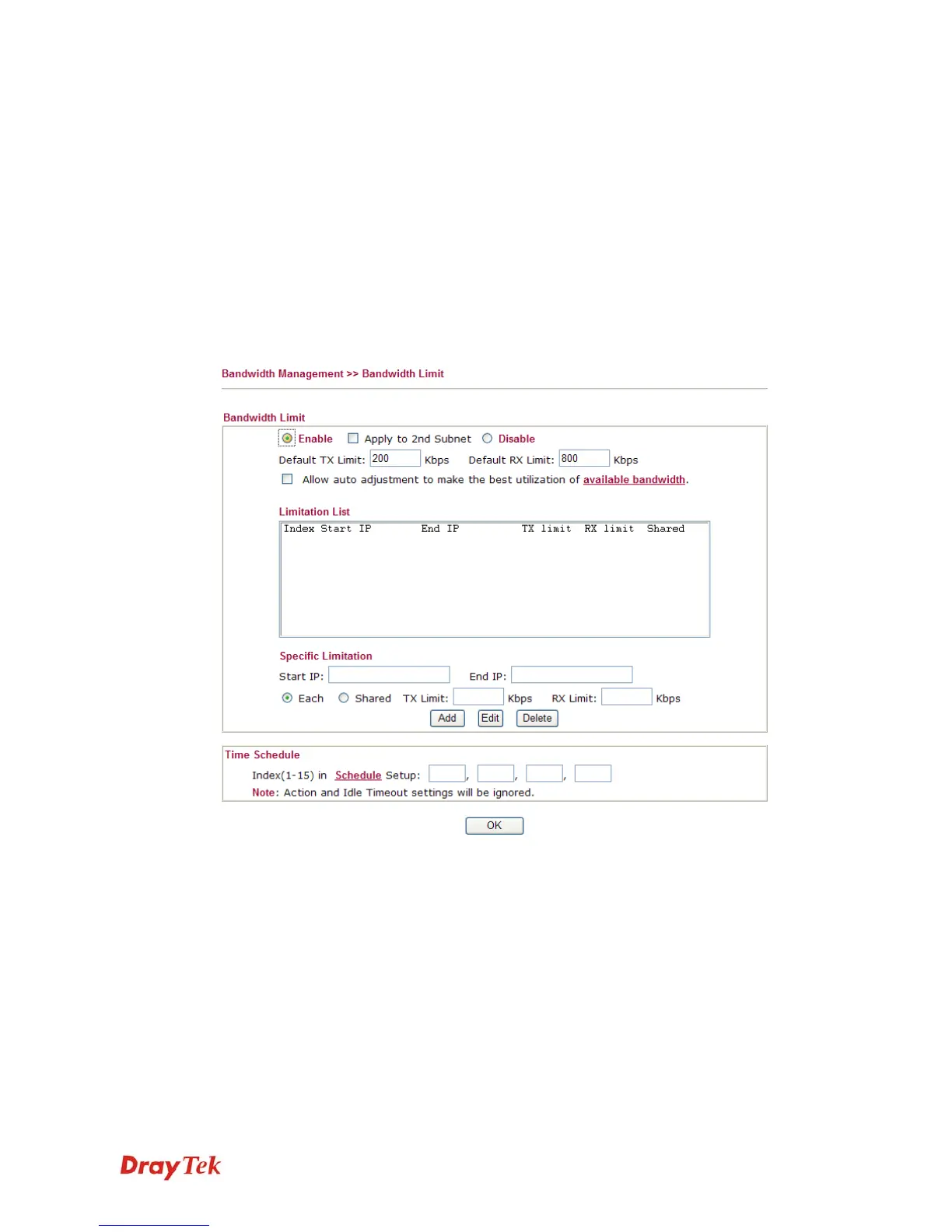 To activate the function of limit bandwidth, simply click Enable and set the default upstream
