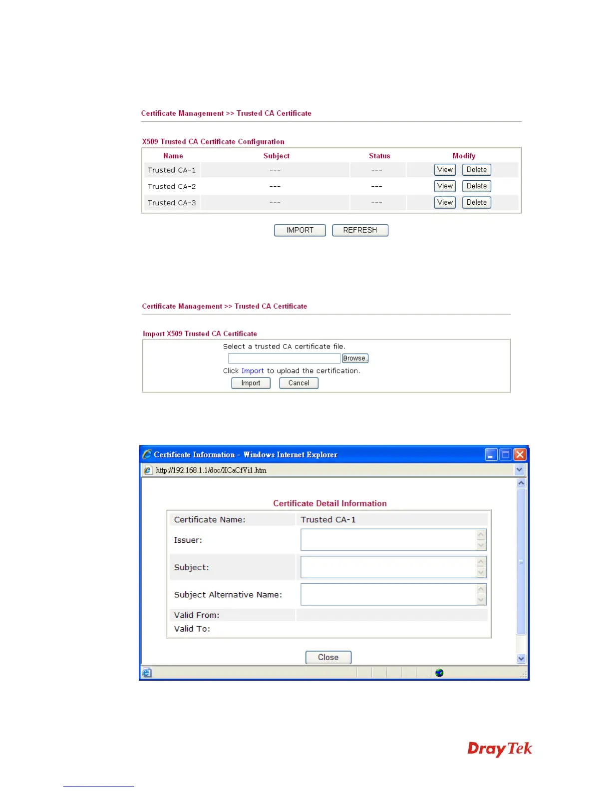 imported will be listed on the Trusted CA Certificate window. Then click Import to use the