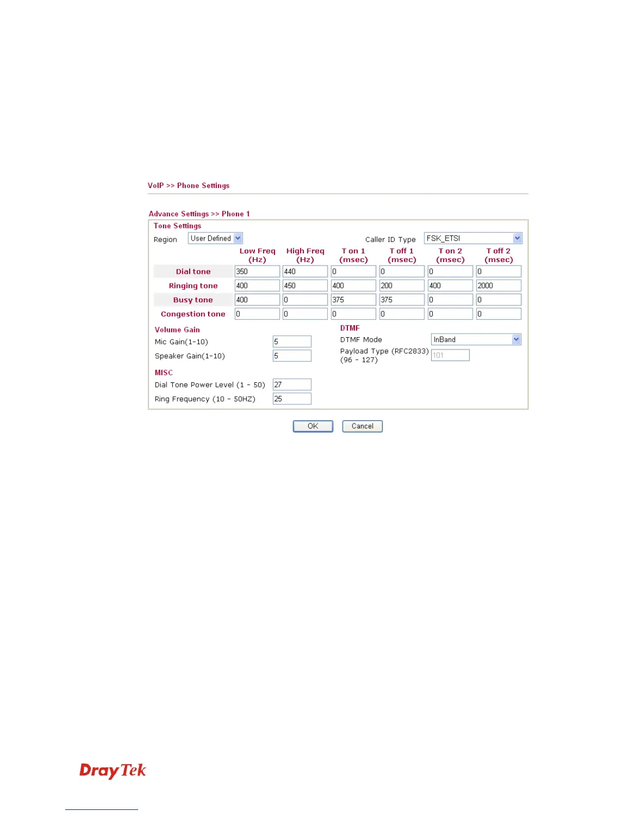 settings of Caller ID Type, Dial tone, Ringing tone, Busy