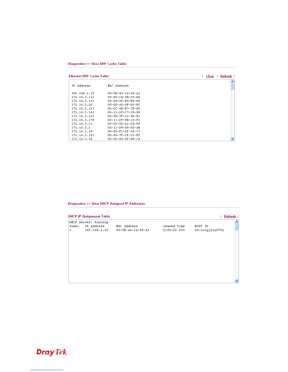Click Diagnostics and click DHCP Table to open the web page.