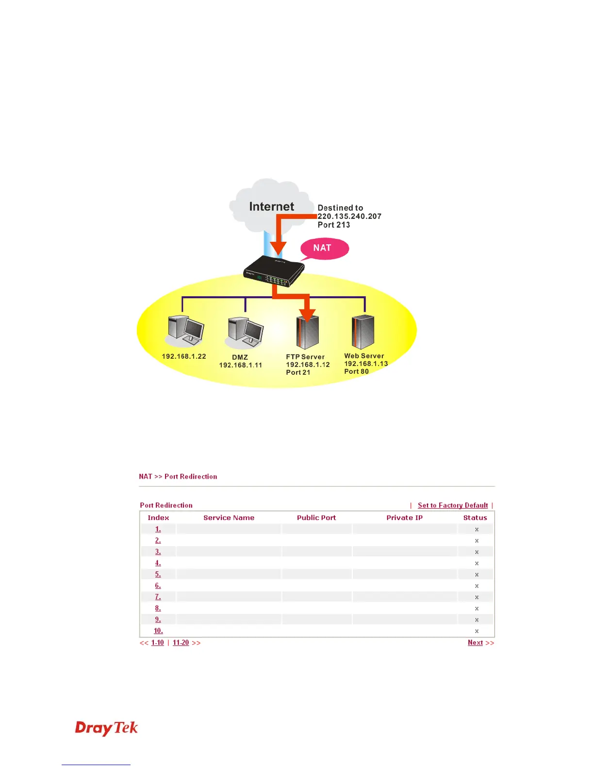 To use this function, please go to NAT page and choose Port Redirection web page. The