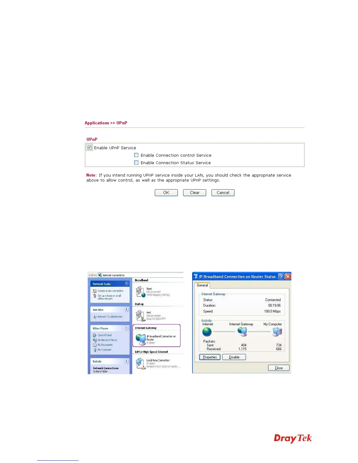 After setting Enable UPNP Service setting, an icon of IP Broadband Connection on Router