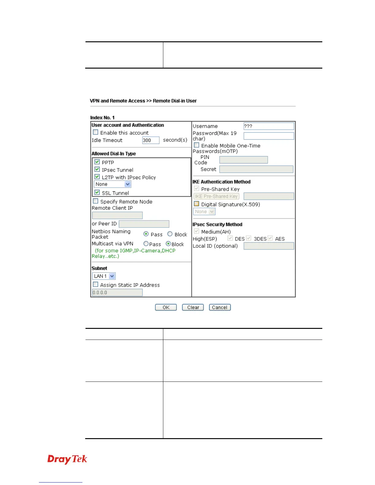 Click each index to edit one remote user profile. Each Dial-In Type requires you to fill the