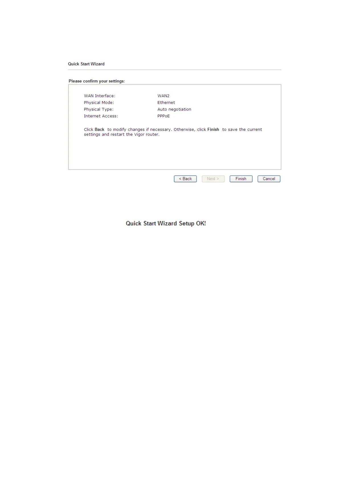 4. Click Finish. A page of Quick Start Wizard Setup OK!!! will appear. Then,