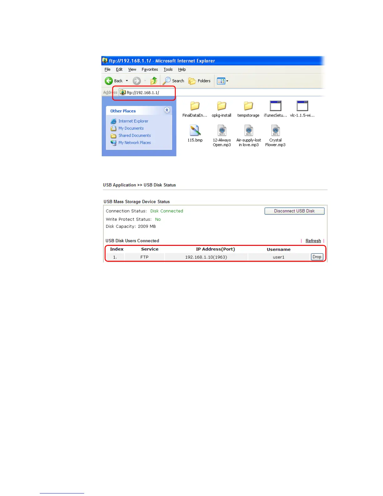 7. Return to USB Application >> USB Disk Status. The information for FTP server will be
