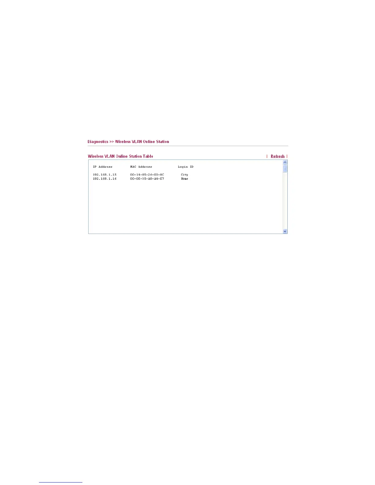 Click Diagnostics and click Wireless VLAN Online Station Table to open the web page. It