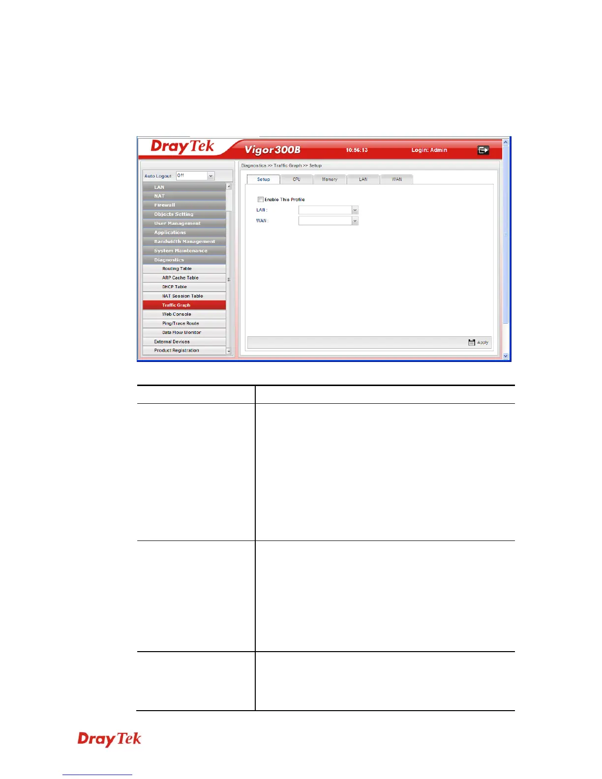 Click Diagnostics and click Traffic Graph to pen the web page. Specify LAN and WAN