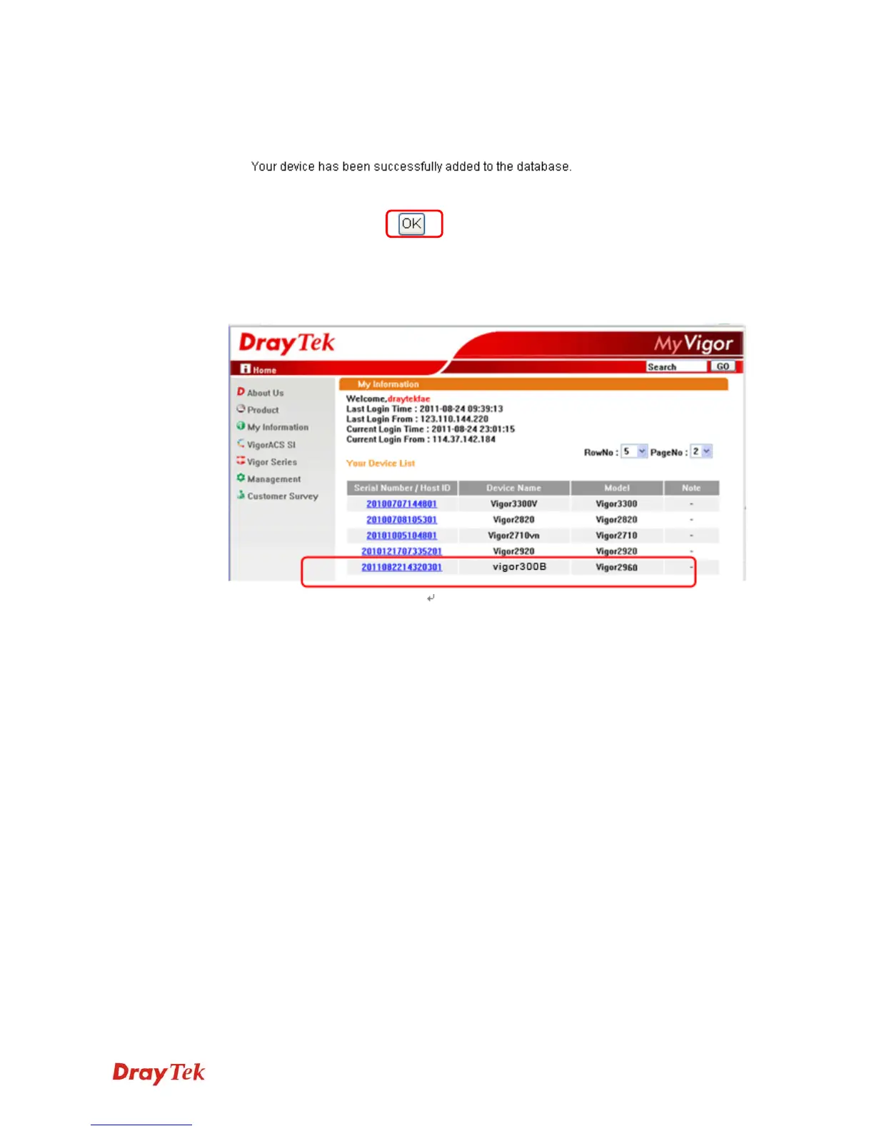 6 Take a look at the page of My Information, the new added Vigor300B is listed under