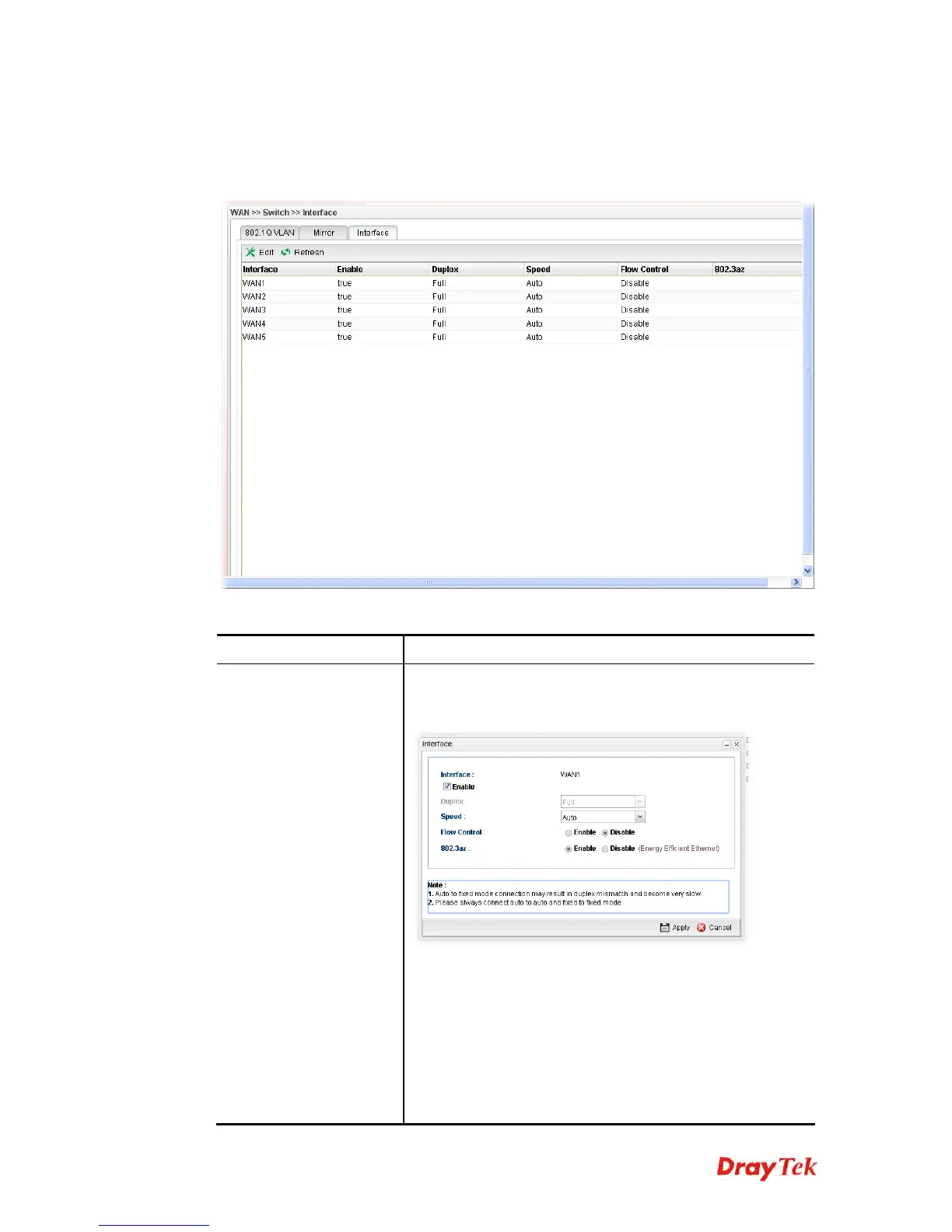 This page allows you to modify the status (enable / disable), duplex (Half/Full), speed, flow