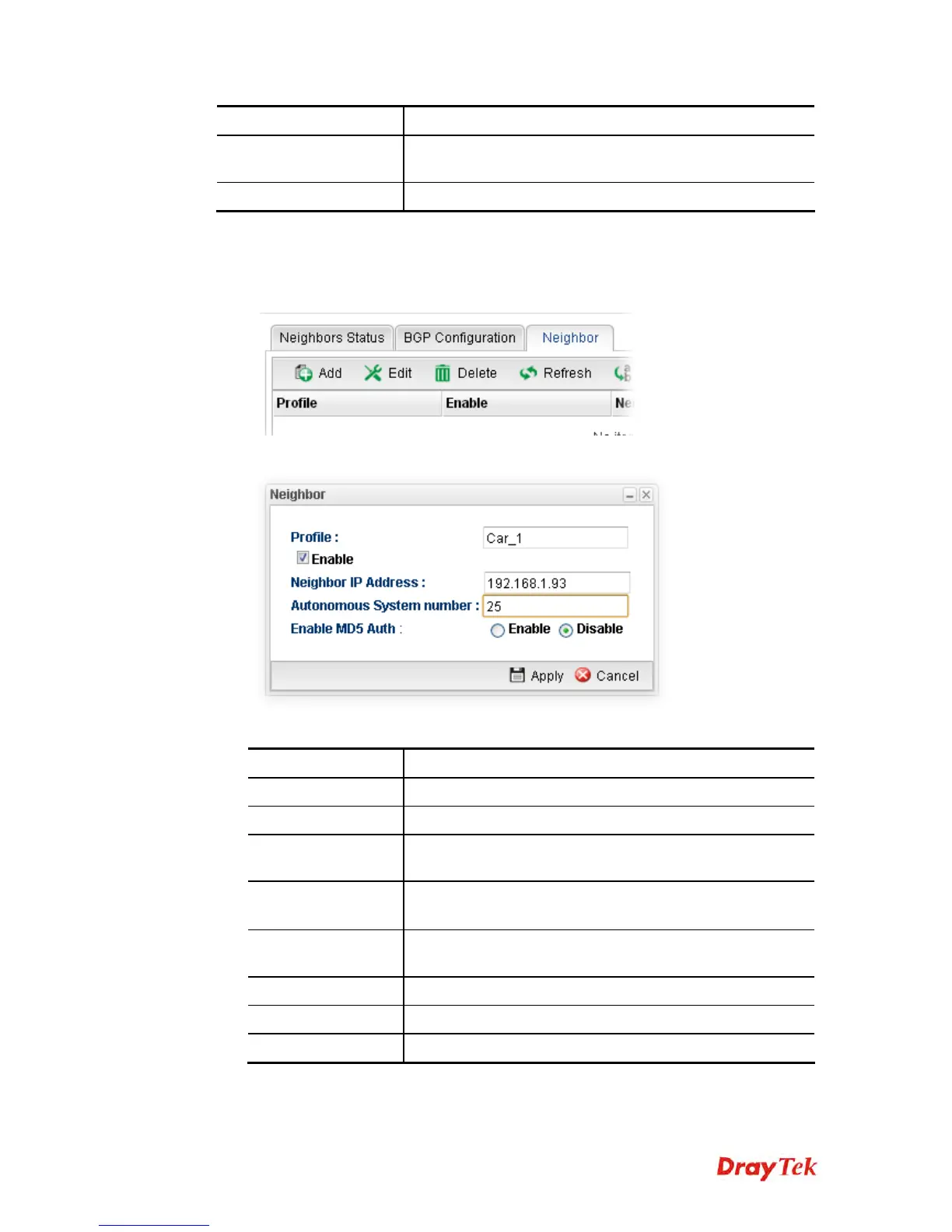 1. Open Routing>> BGP Configuration and click the Neighbor tab.