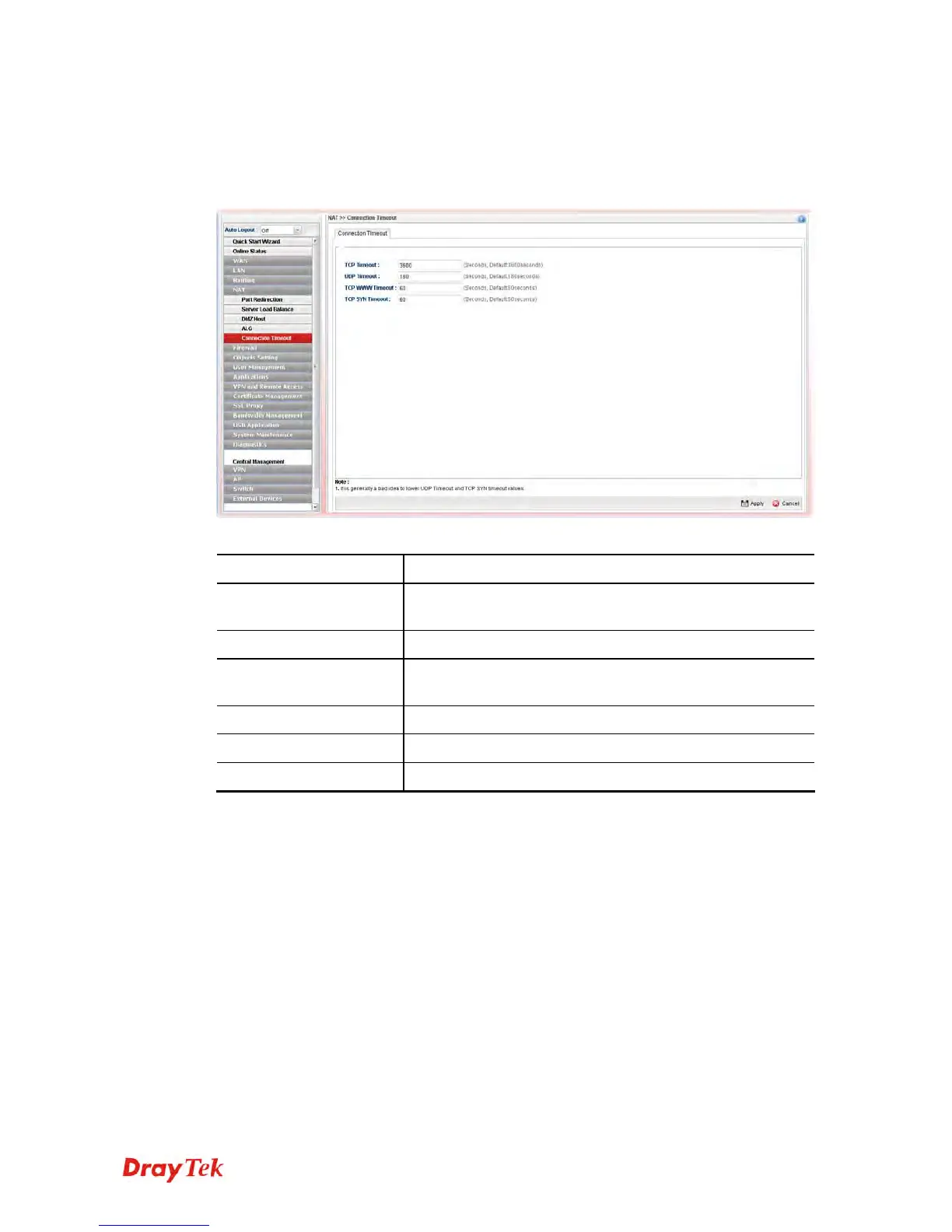 This feature is used to configure timeout setting for sessions established by TCP/UDP. When