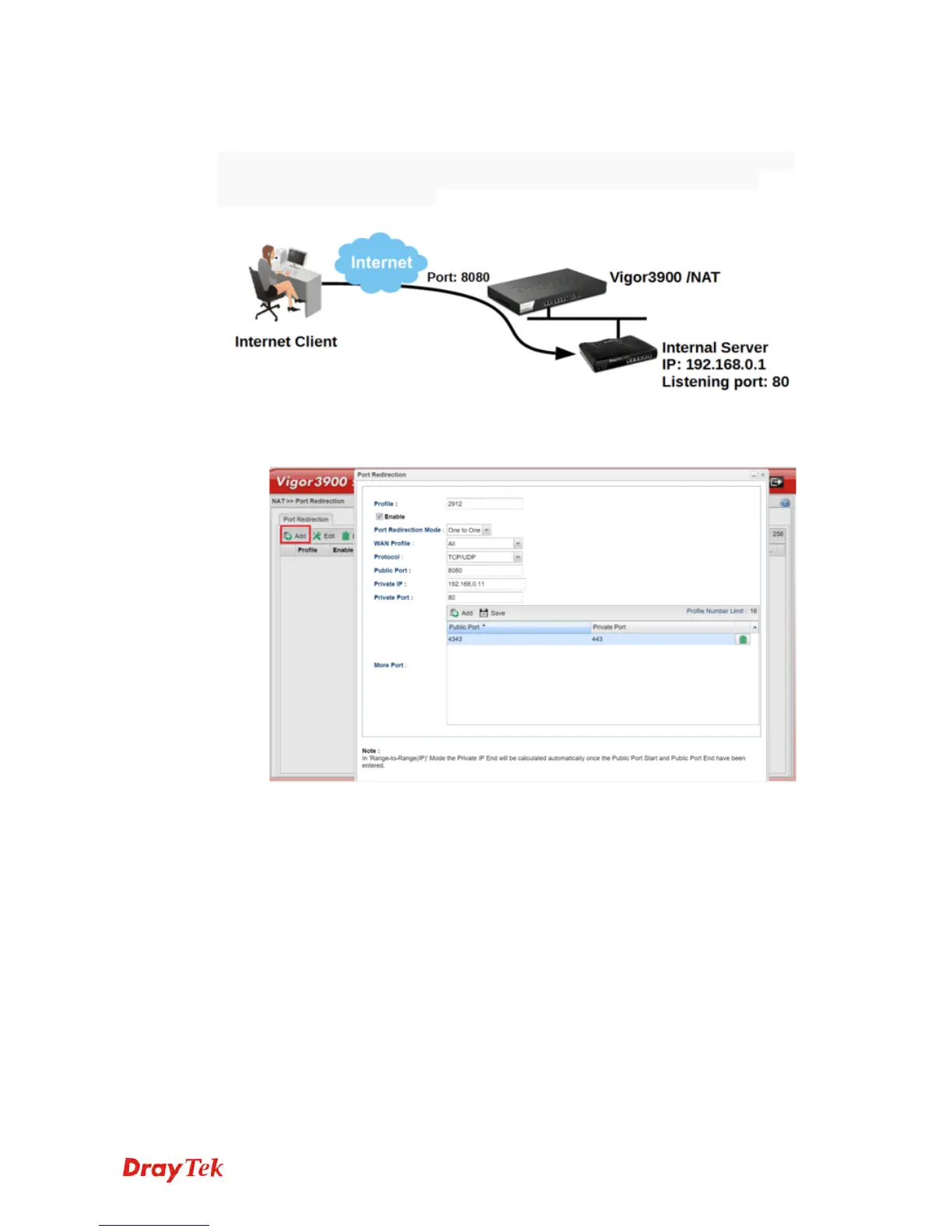 1. Go to NAT >> Port Redirection, click Add to create a profile.
