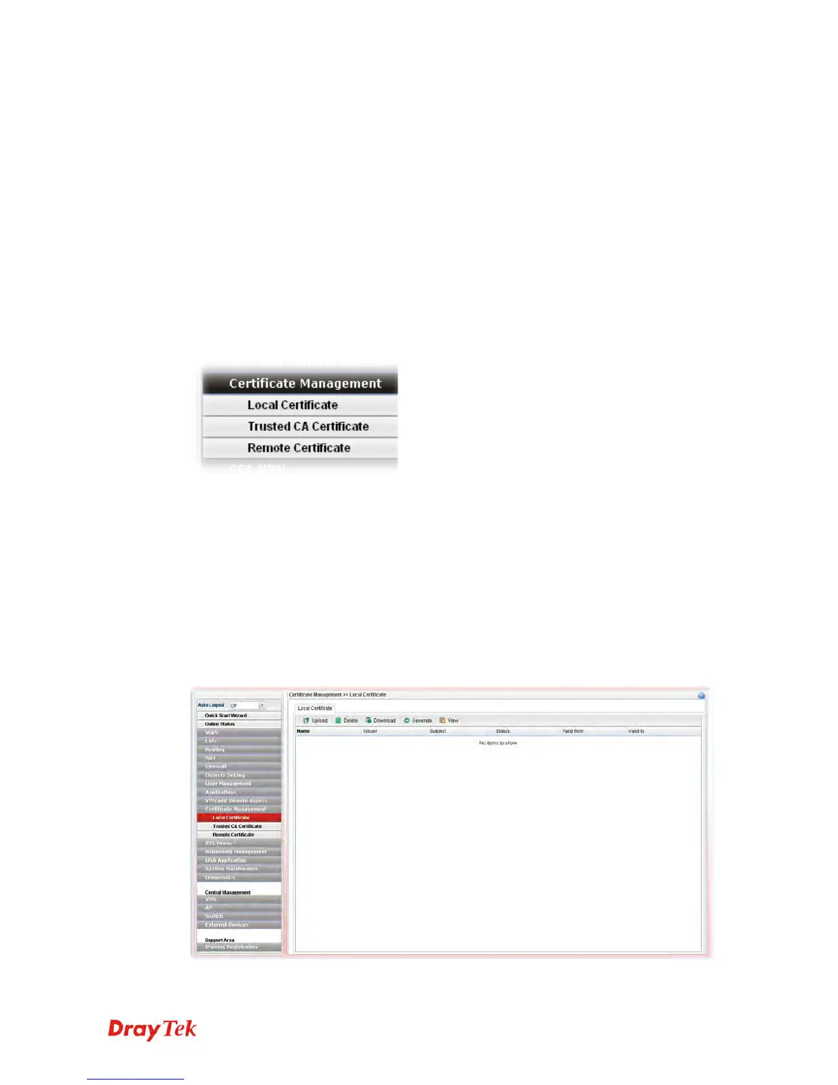 Below shows the menu items for Certificate Management.