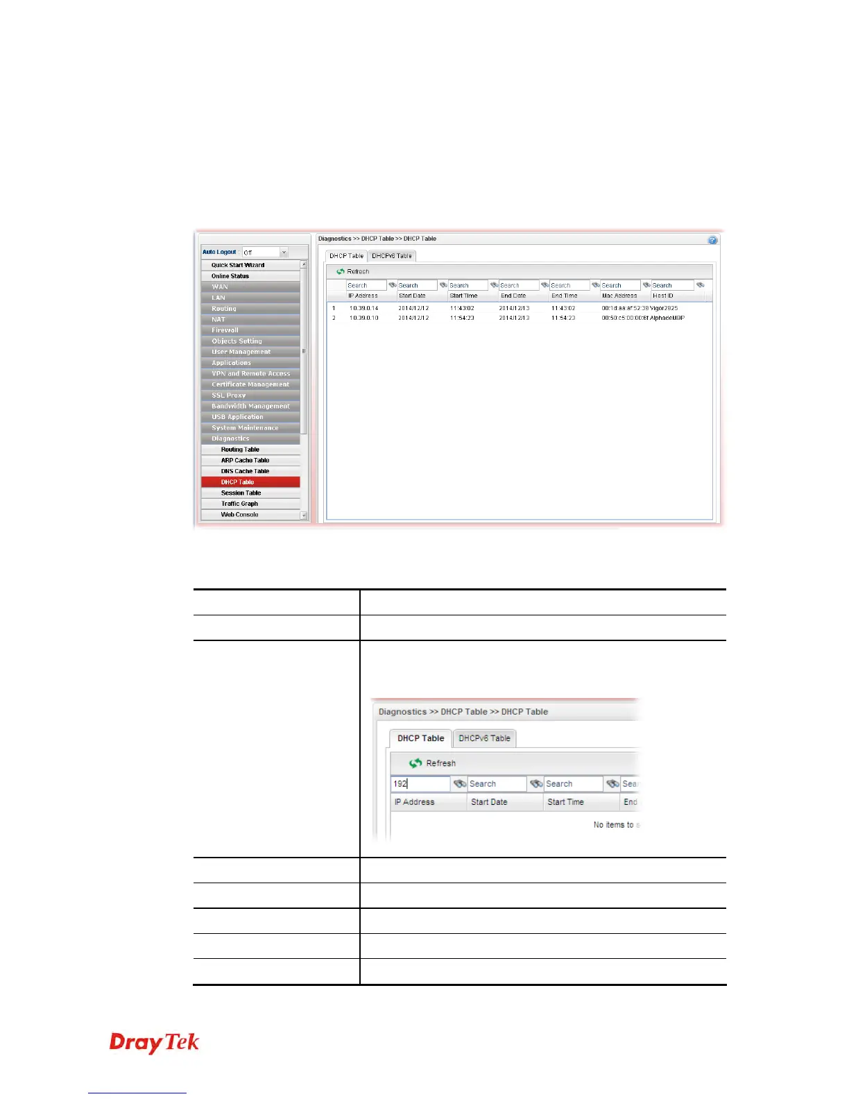 Click Diagnostics and click DHCP Table to open the web page.