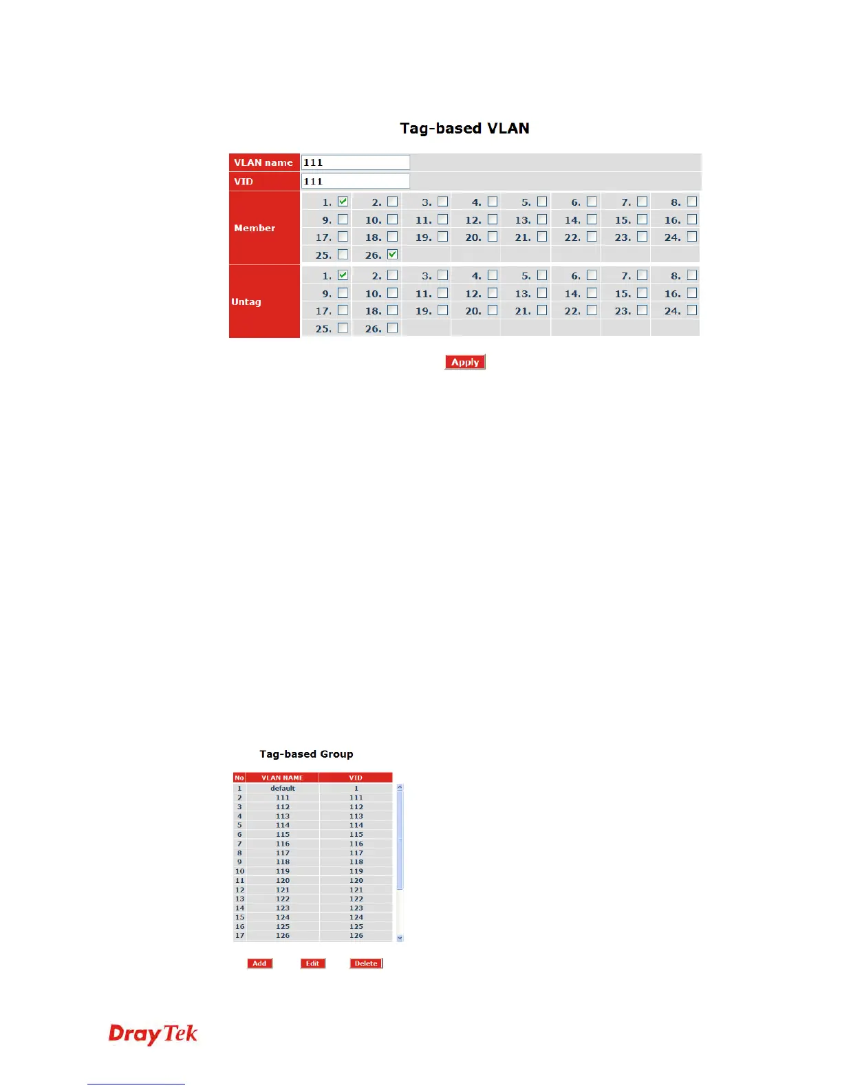 In Member field, select Port 1 and Port 26 as members of VLAN Group 111.
