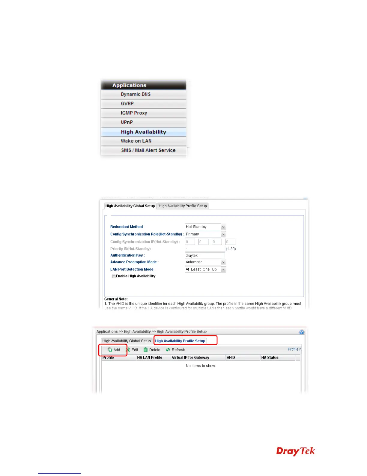 4. Click the High Availability Profile Setup tab to create HA profile(s). Click Add.