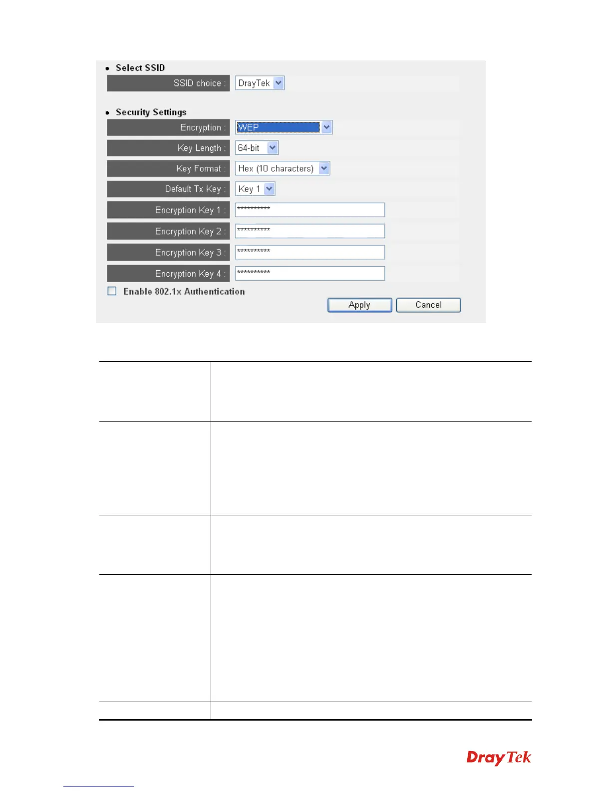 Default Tx Key You can set up to four sets of WEP key, and you can decide which