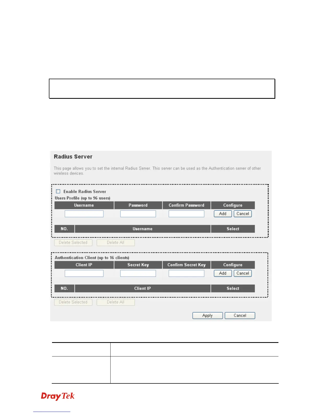 Enable Radius Server Check this box to enable internal radius server function.