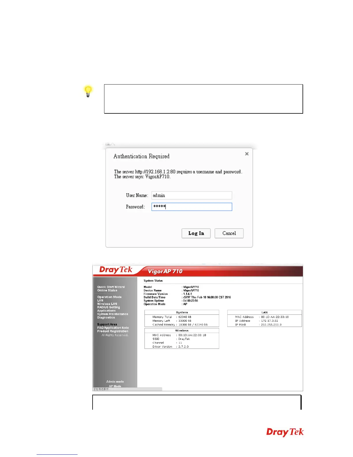 as the default IP address of VigorAP 710 192.168.1.2. For the detailed