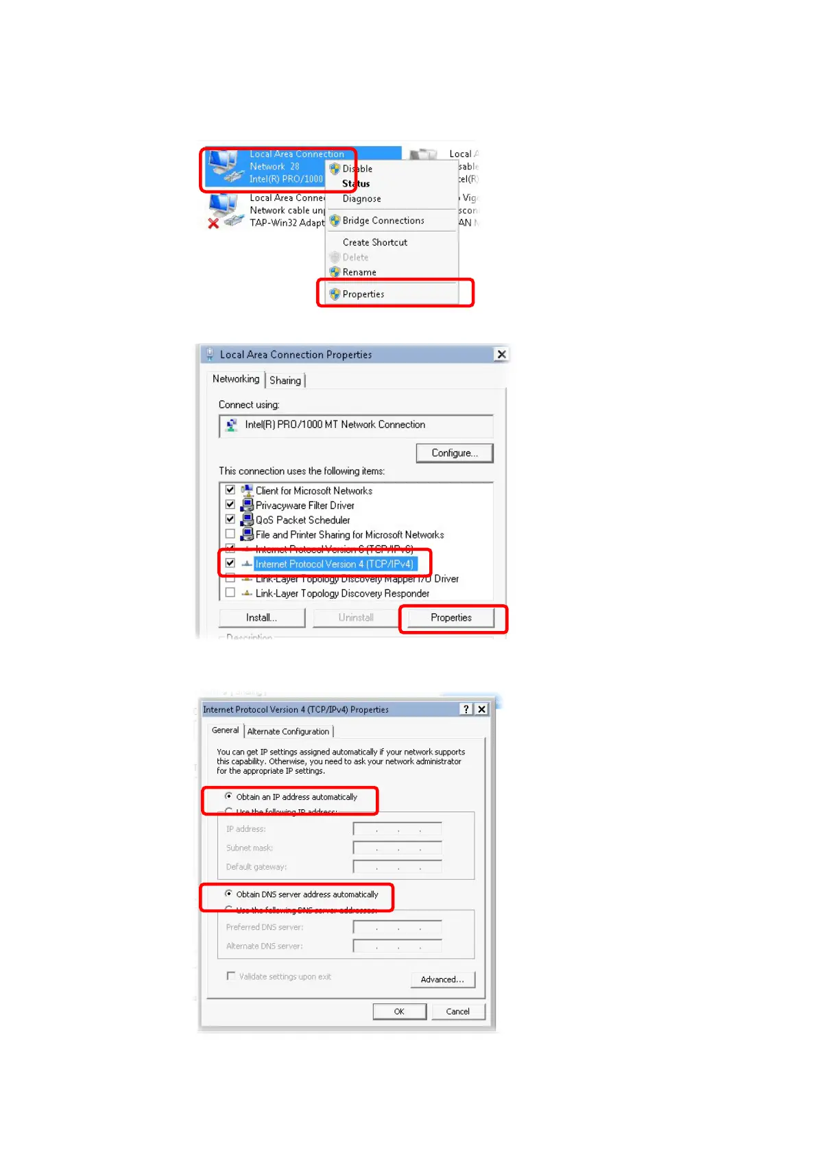 5. Select Obtain an IP address automatically and Obtain DNS server address