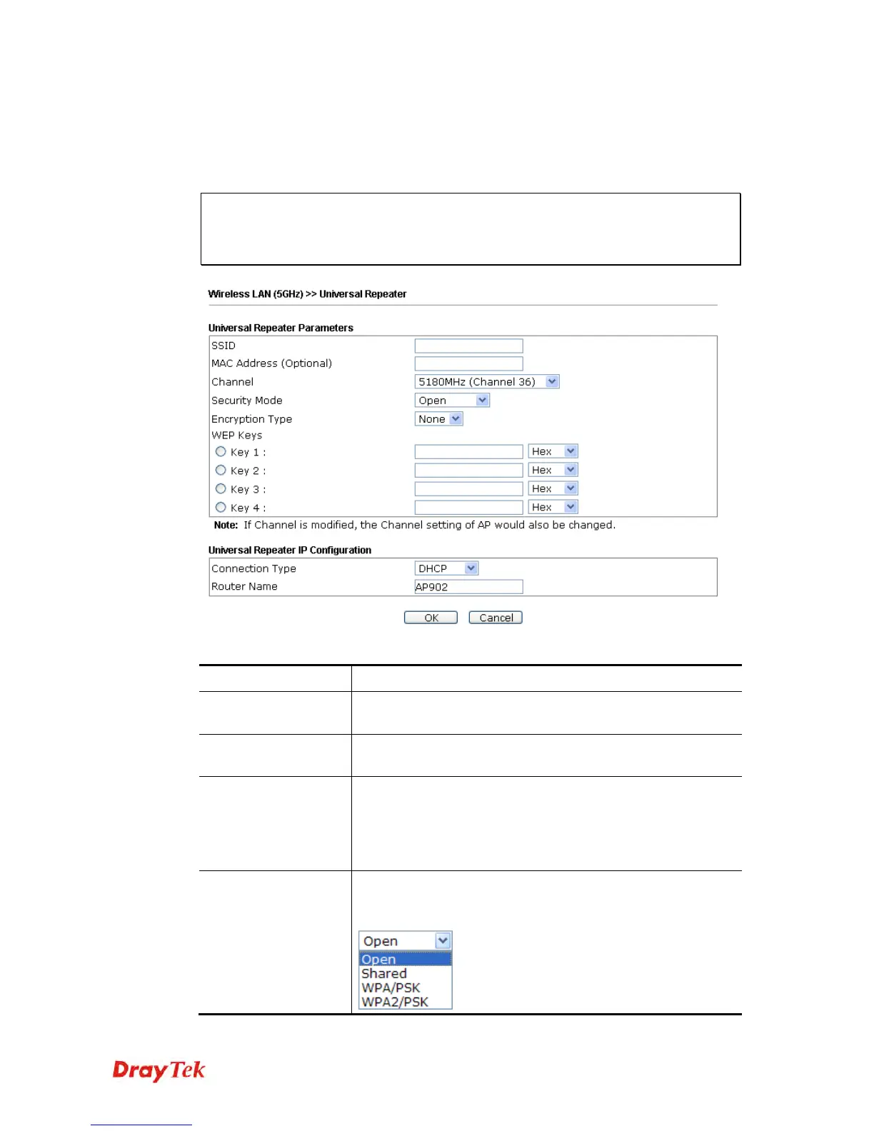 mode will bring up different parameters (e.g., WEP keys, Pass
