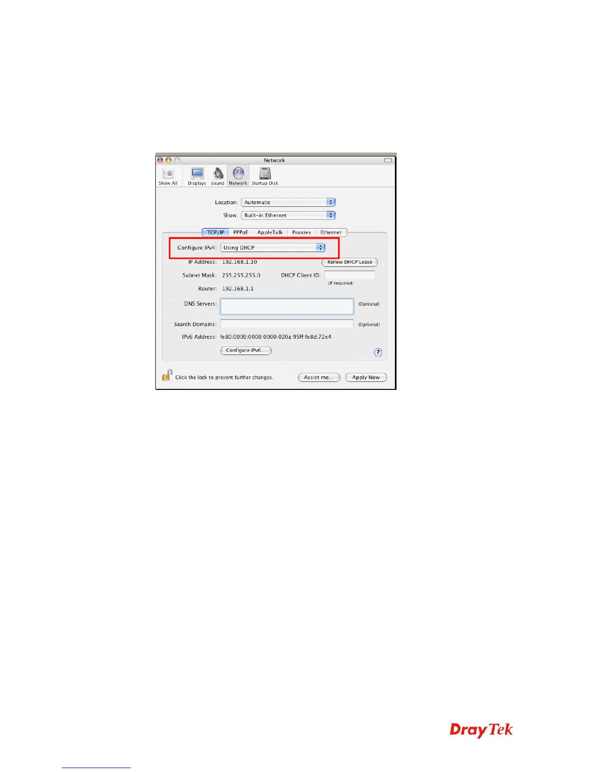 3. On the Network screen, select Using DHCP from the drop down list of Configure