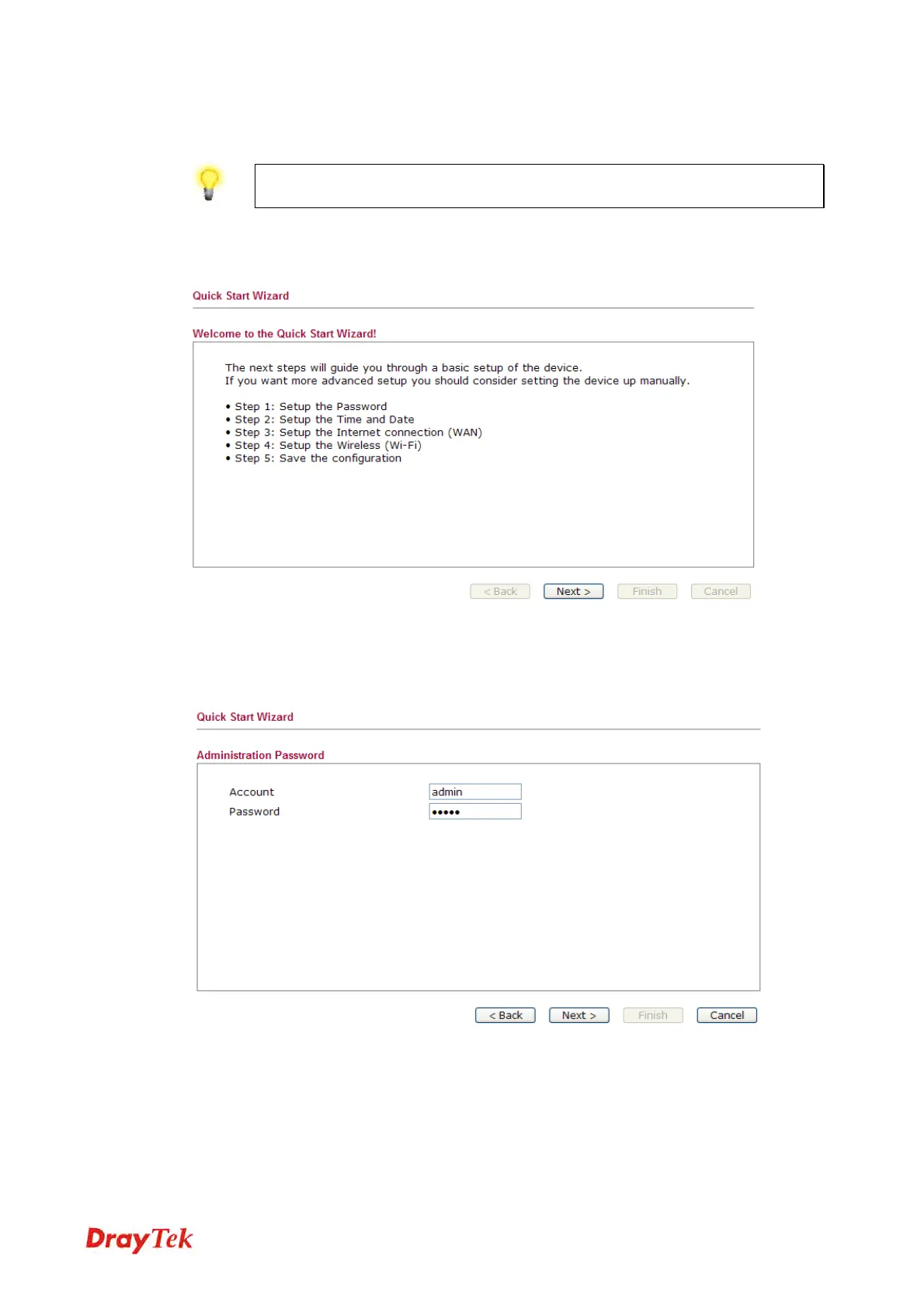 Notice: Quick Start Wizard for user mode operation is the same as for admin