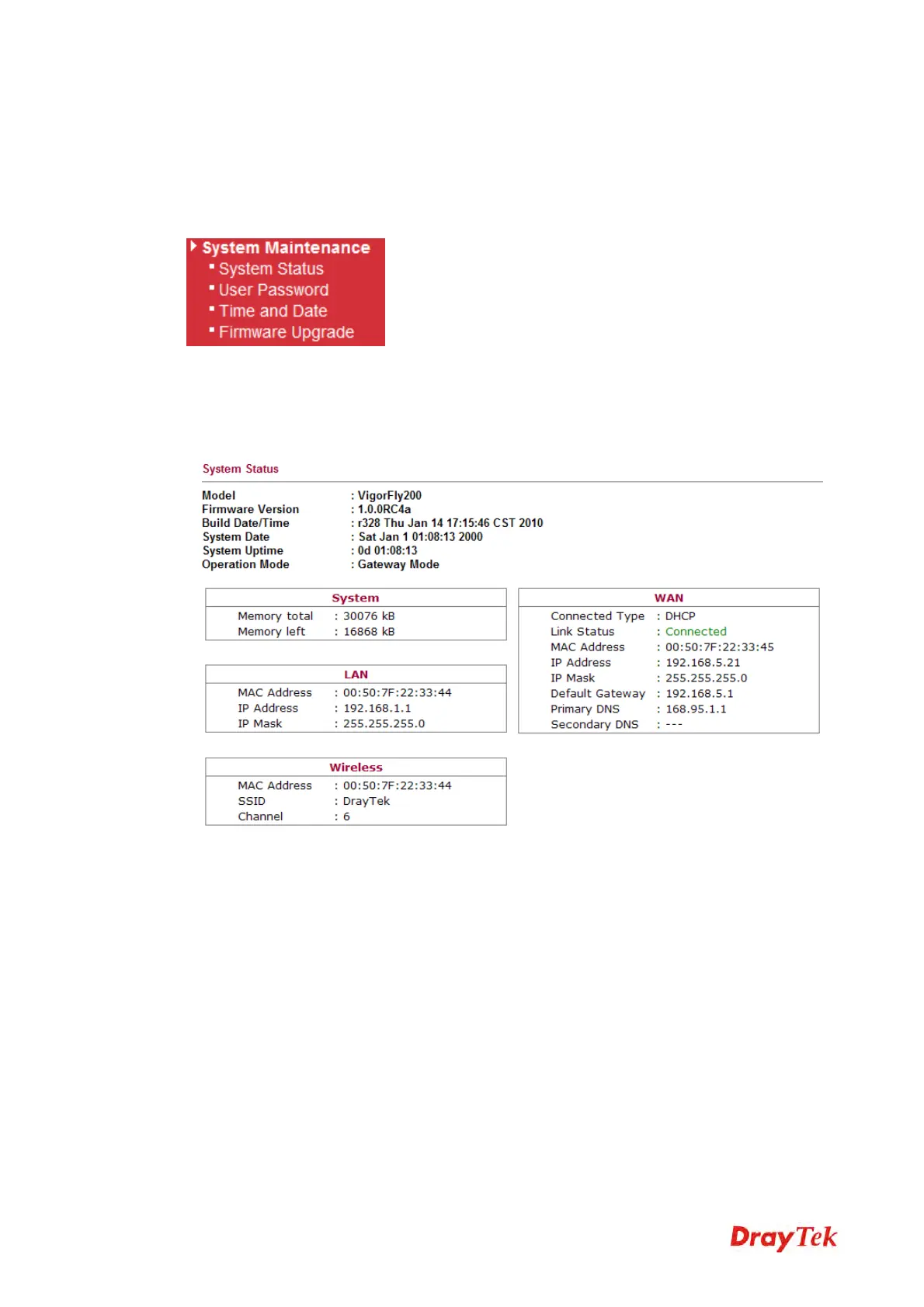 The System Status provides basic network settings of Vigor router. It includes LAN and