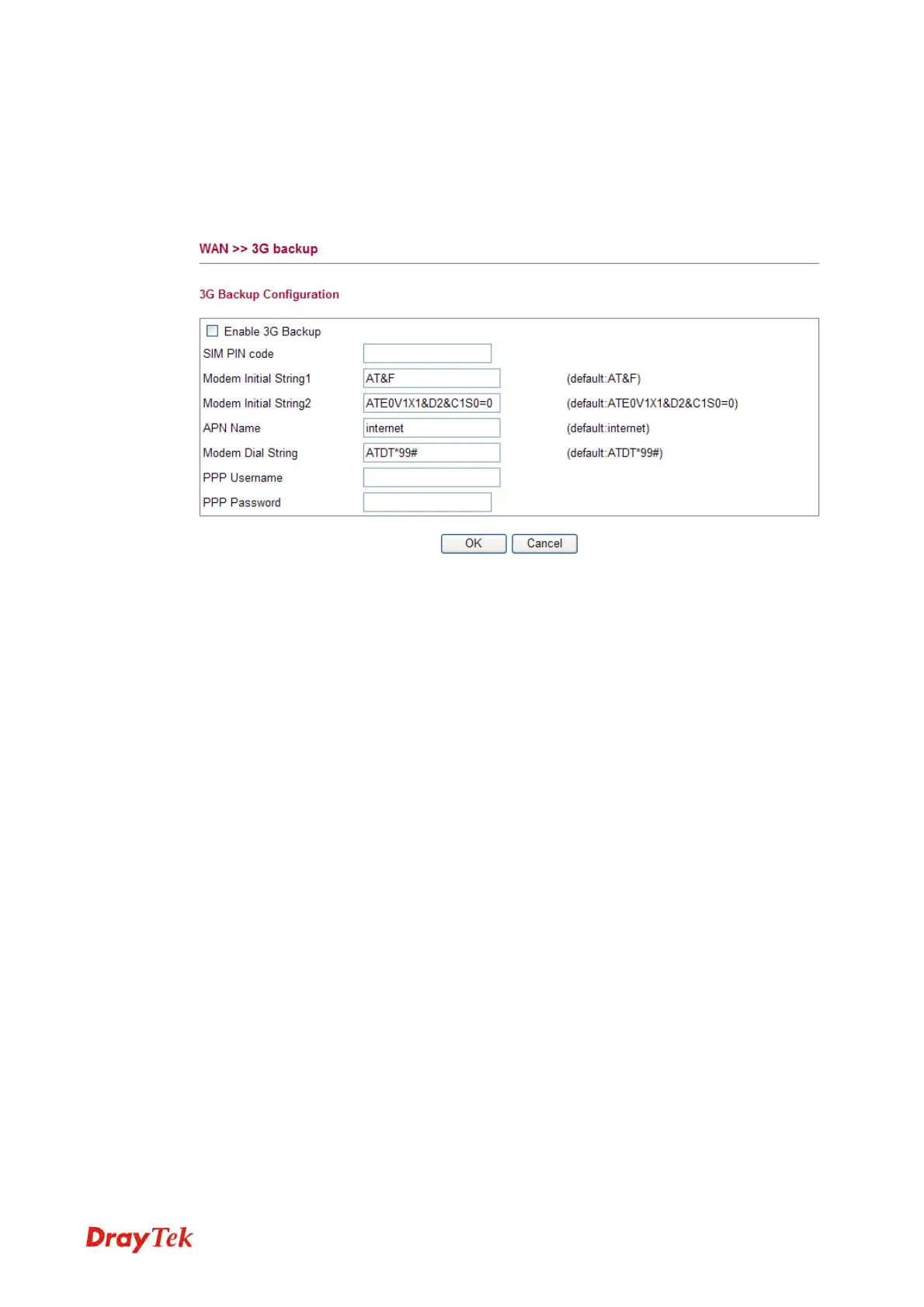 This page is used to setup 3G backup function. If you enable 3G backup, make sure your