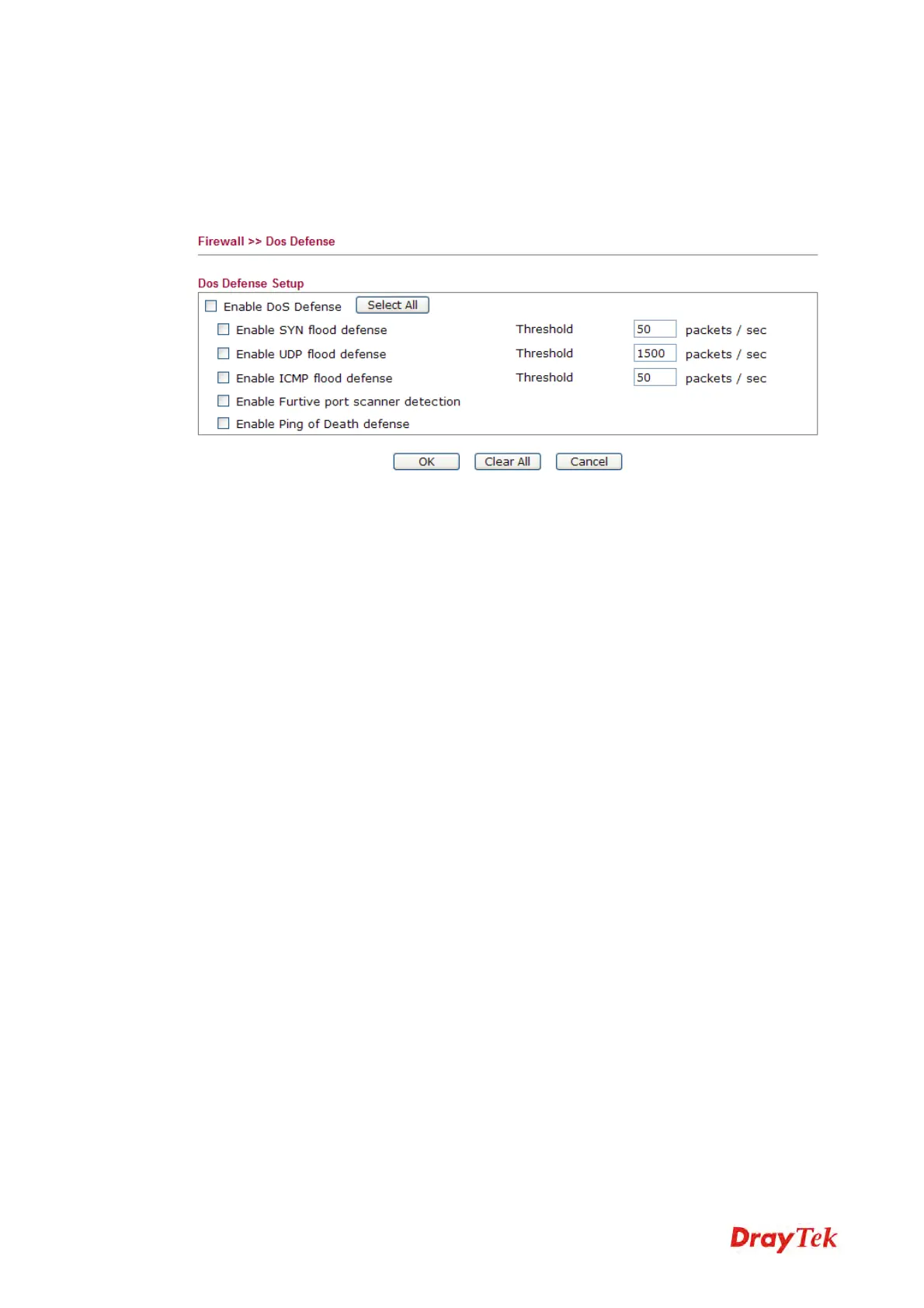 DoS Defense setup. The DoS Defense functionality is disabled for default.