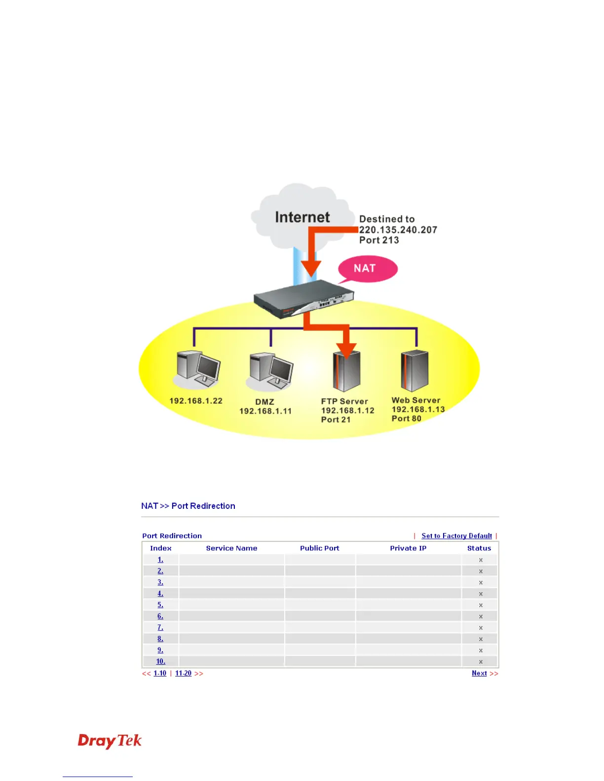 To use this function, please go to NAT page and choose Port Redirection web page. The