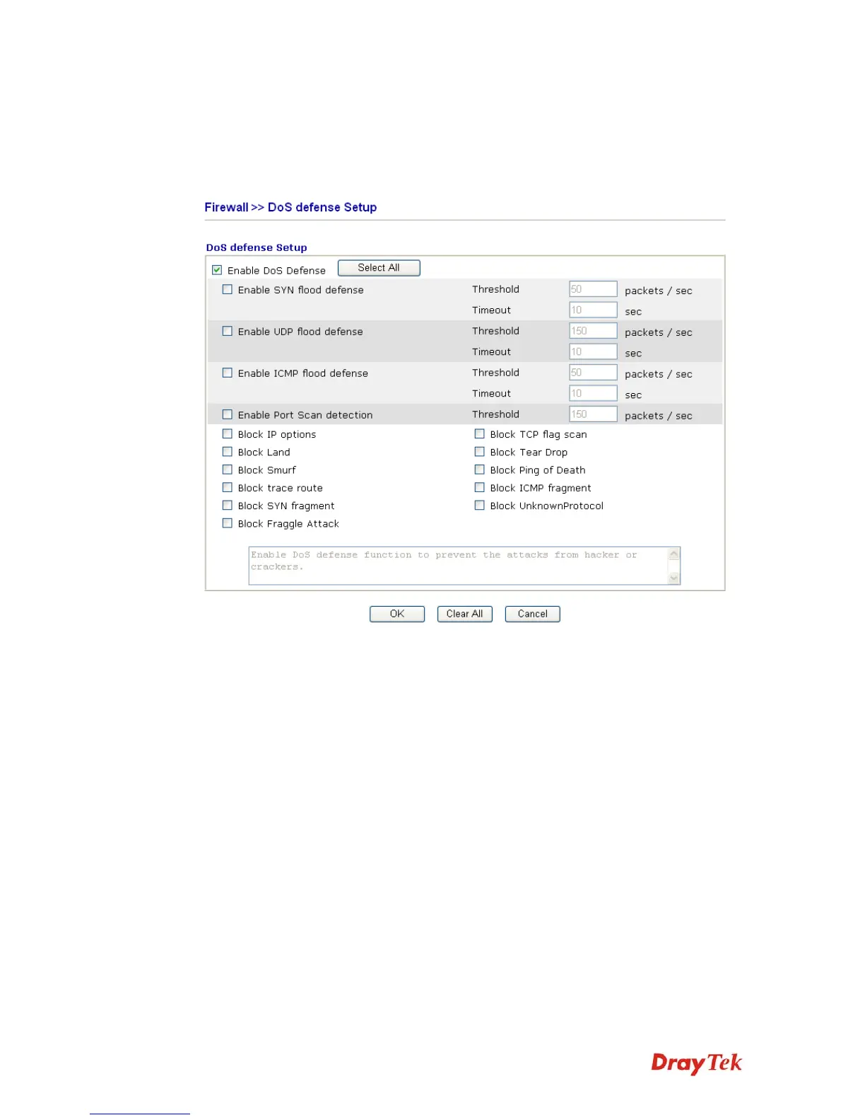 the DoS Defense setup. The DoS Defense functionality is disabled for default.
