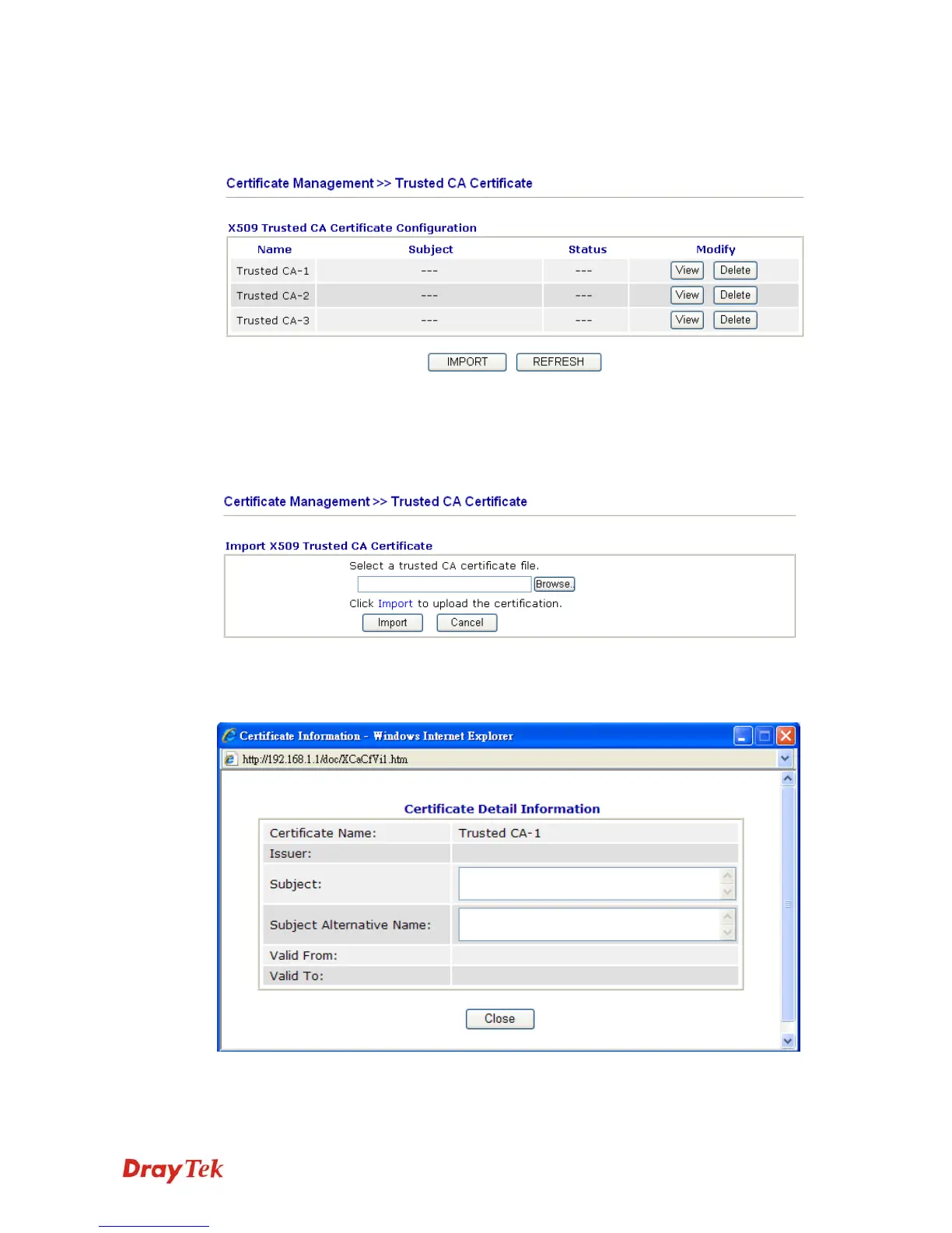 imported will be listed on the Trusted CA Certificate window. Then click Import to use the