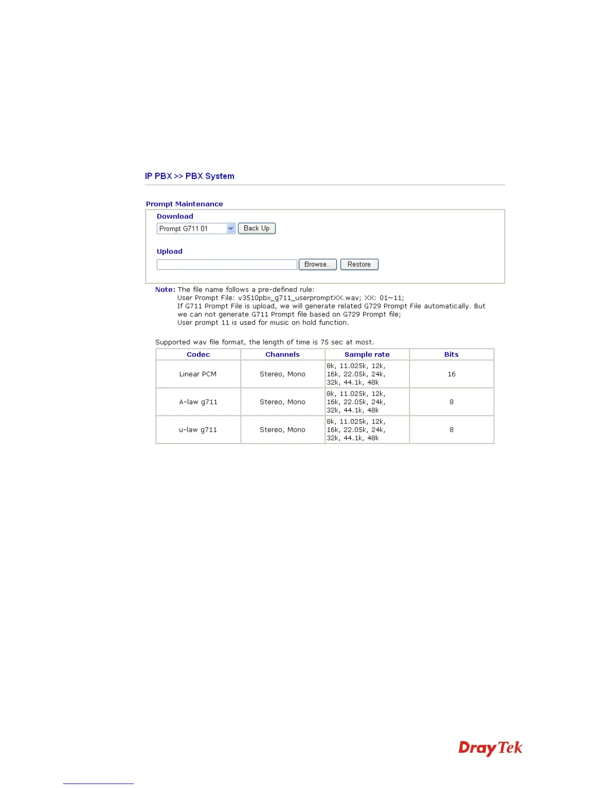 PBX system playing. Users can record audio files and upload to router or download to PC.