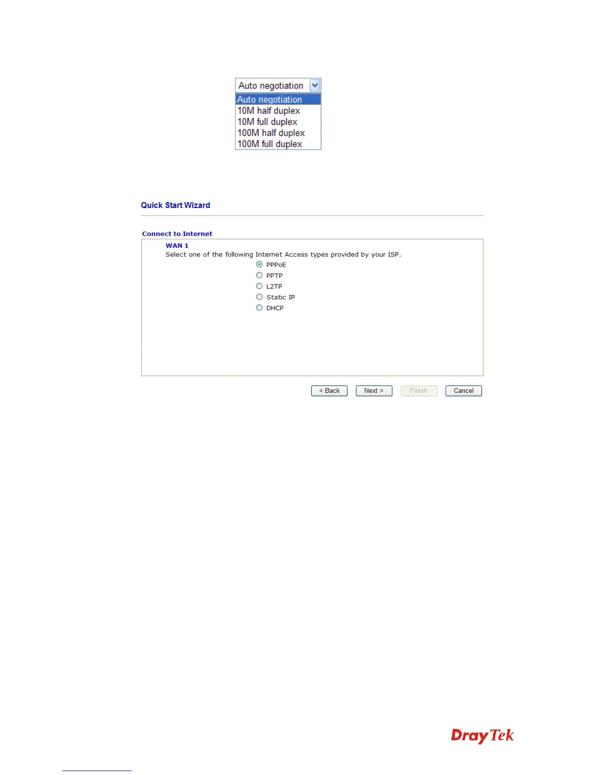 In the Quick Start Wizard, you can configure the router to access the Internet with different