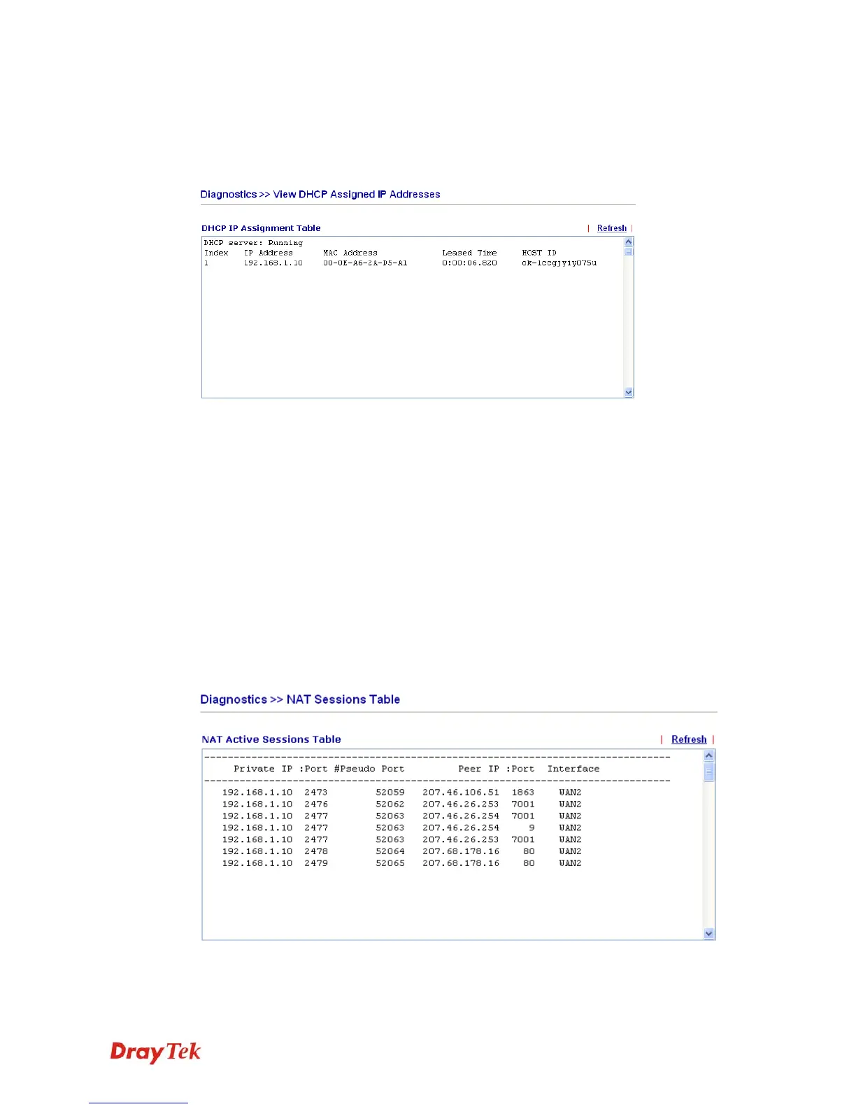 Click Diagnostics and click DHCP Table to open the web page.