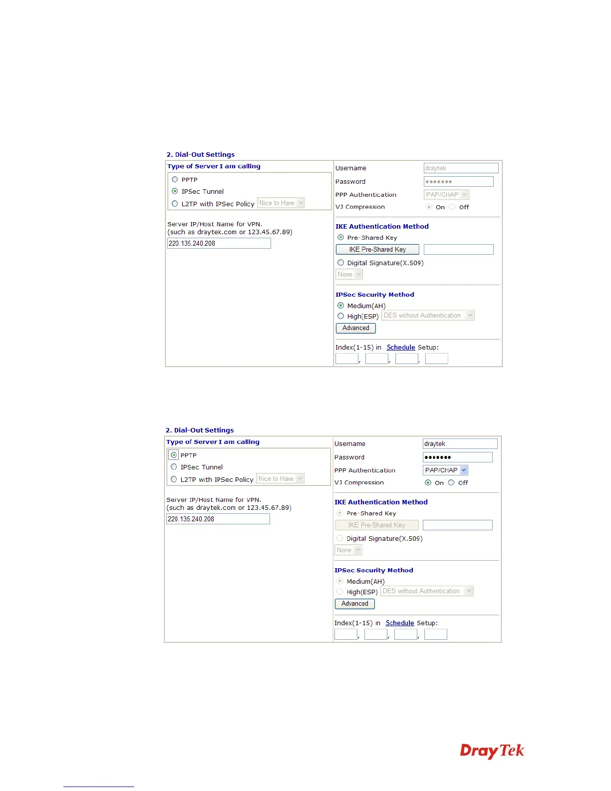 Address, IKE Authentication Method and IPSec Security Method for this Dial-Out