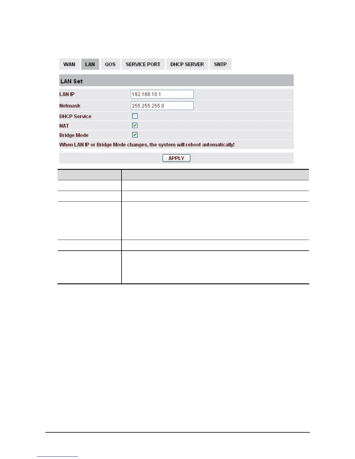 DHCP Service Select the DHCP server of LAN port or not. After you modify the LAN